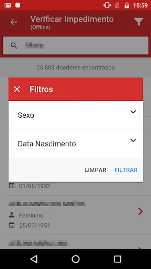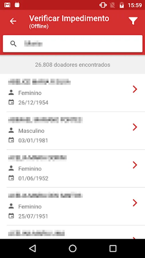 This application, facing the State of Paraná Hematology Services will facilitate consultation prevented donors in external collections where there is no Internet connection, replacing the old paper listing the CDI. You can consult the donor's name, and if necessary apply some filters like sex and / or Date of Birth.