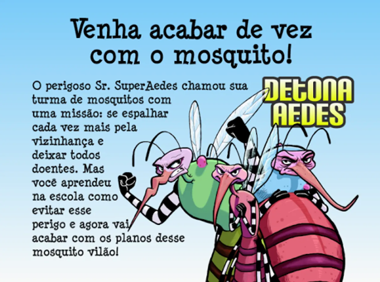 In this fun educational nature, to Point'n'Click (point and click) style, the player will go through phases prepared with lots of action, and will learn about dengue prevention concepts while playing with his friends. Was created thinking in children of school age, without leaving aside the teacher will use in their classes. This does not mean that it can not be played at home!