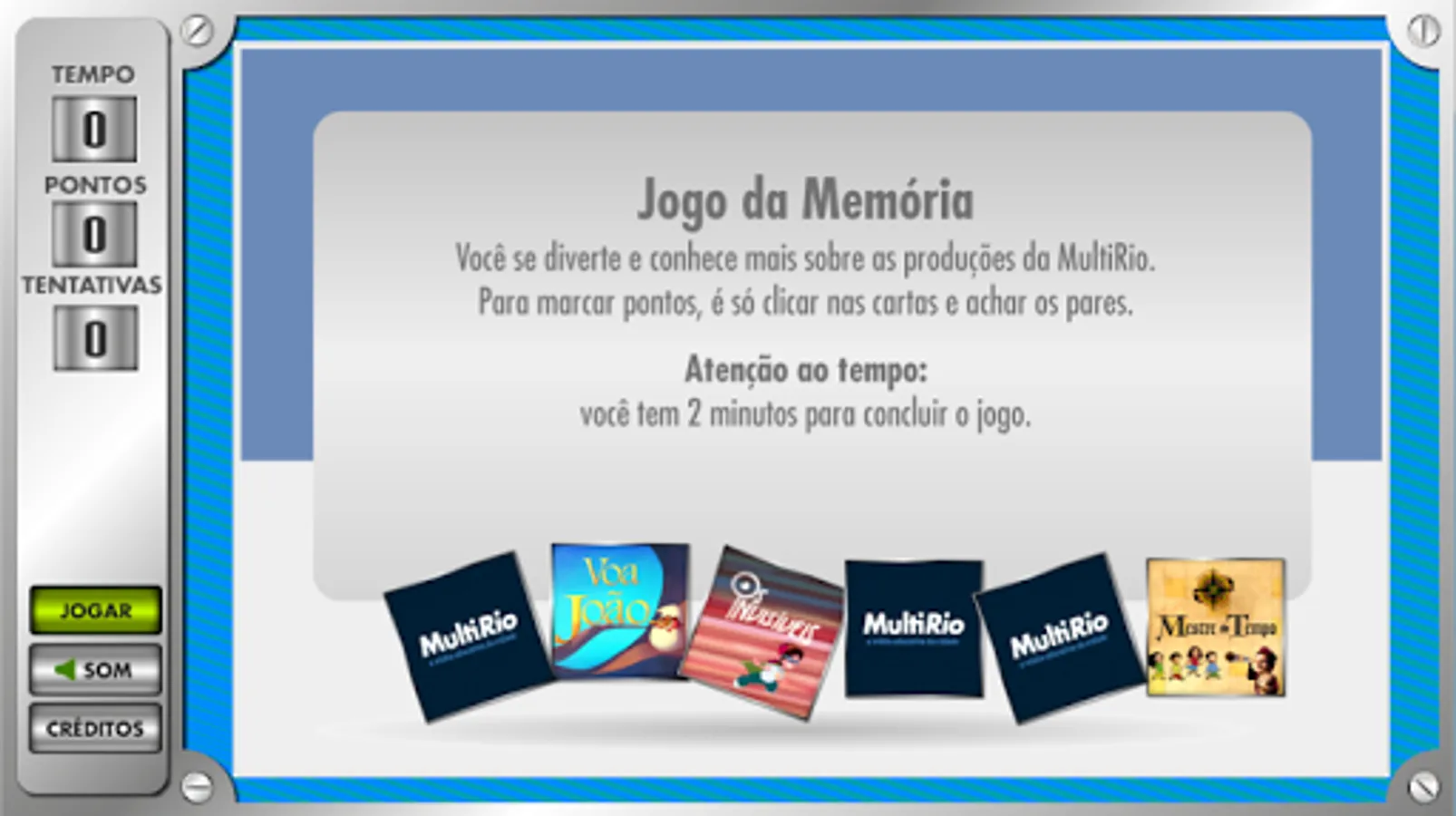You have fun and know more about the productions of MultiRio. To score points, just click on the cards and find the pairs, but attention to time, you have two minutes to complete the game.