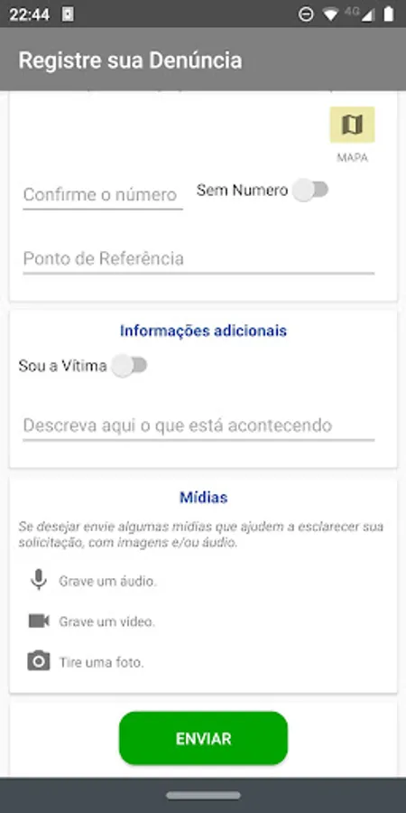 Dear citizen, remember that it is prohibited to pass on false information while using the application, subjecting the person responsible to criminal sanctions, as provided for in Article 340 of the Brazilian Penal Code (Provoking the action of an authority, informing him of the occurrence of a crime or of a misdemeanor that he knows has not taken place. Penalty – detention of one to six months, or fine).