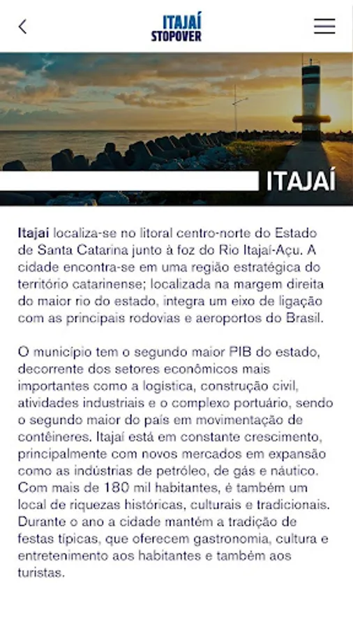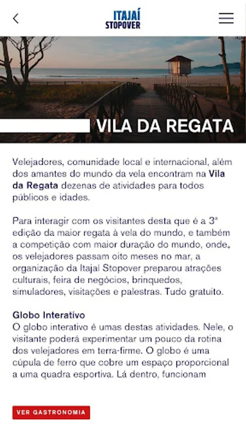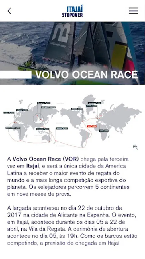 The ITAJAÍ Stopover application was developed by the Technological Center of the City of Itajaí / SC to meet the Brazilian leg of the Volvo Ocean Race 2018, the "Formula 1 of the Seas", which will take place between 05-22 of April.