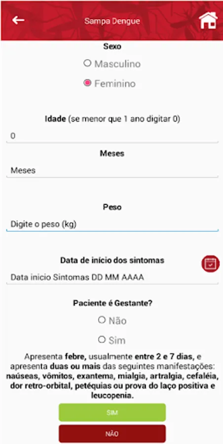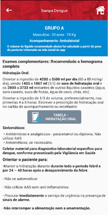 Based on the information on the age, sex and weight of the patient suspected of having dengue, the application helps the healthcare professional to classify the risk and indicates the necessary measures for the case, such as quantity of oral hydration fluid, the need to carry out additional tests , discharge criteria, among others.