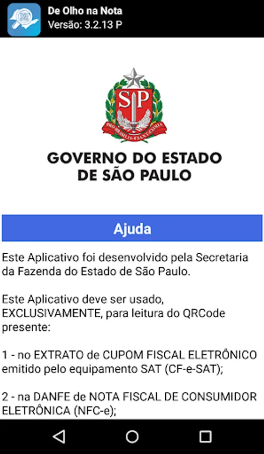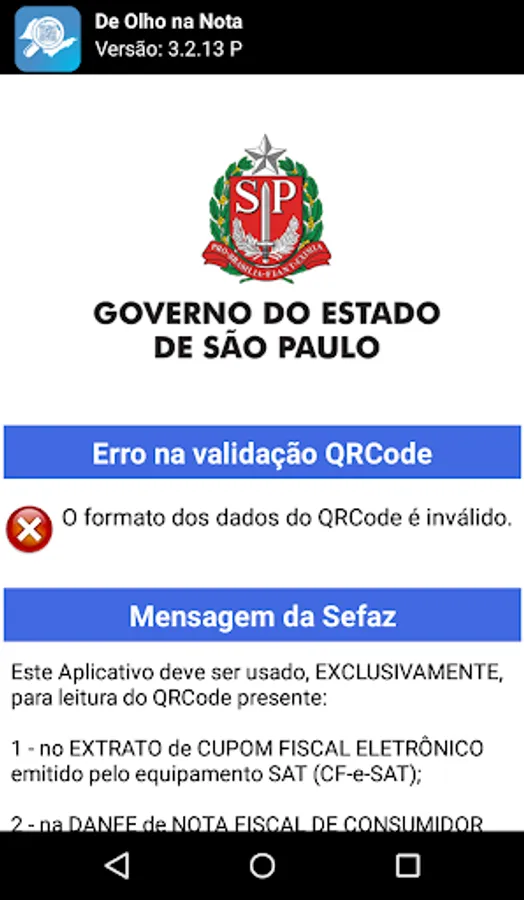 Application of the São Paulo State Treasury to verify Tax Receipt and Electronic Invoice Electronic Consumer issued in the State of São Paulo. Through the phone's camera, scan the QR Code printed on the Electronic Tax Receipt extract to see if it was generated from the data of a SAT equipment regularly recorded in the Department of Finance. The SAT equipment is new equipment that generates the Fiscal Electronic Coupon and transmits it via Internet to the Department of Finance, replacing the Tax Receipt paper and fiscal printers. The app also displays the main data of purchase. It can also be used for reading the QR code DANFE of Fiscal Electronic Consumer Note, in which case you see all the purchase data. Should not be used for reading other types of QRCode.