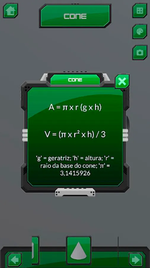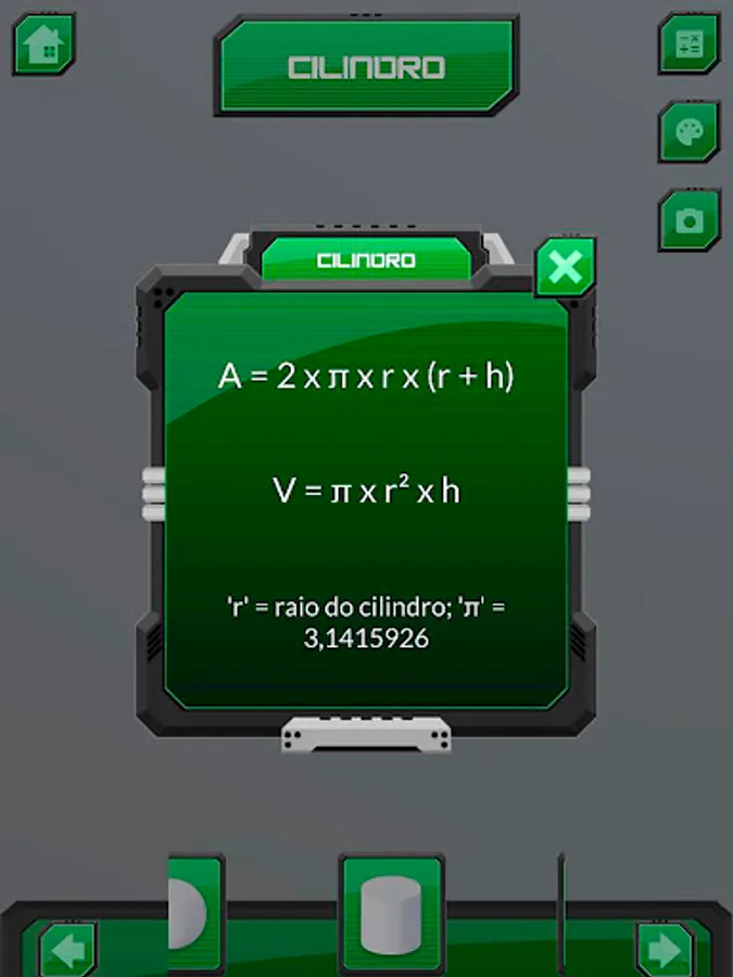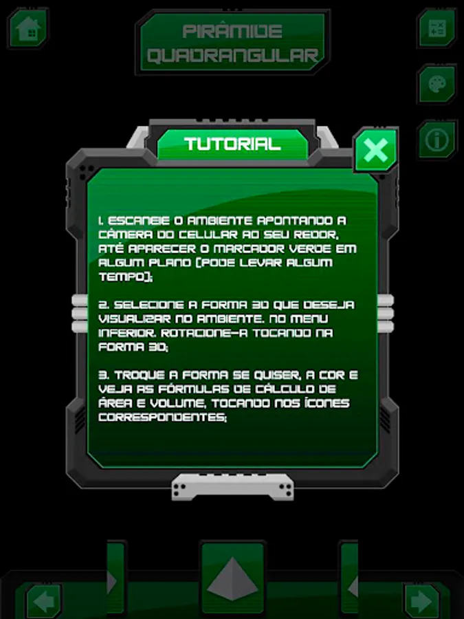 Application aimed at elementary school math students. With it, it is possible to see different forms of spatial geometry, such as cube, sphere, cylinder, pyramids and prisms, among others, interact with them through rotation and scale, in addition to changing colors. It is also possible to see the formulas for calculating the area and volume of each of the solids.