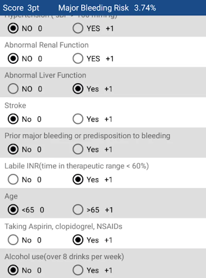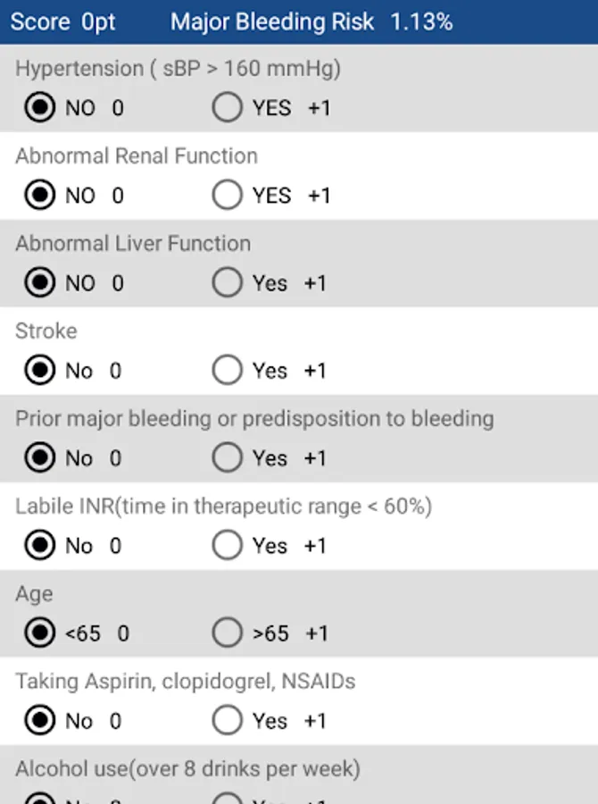 This app calculates the HAS-BLED score and displays the risk of major bleeding.