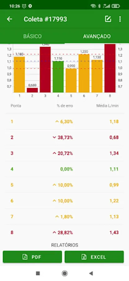 Through the App, it is possible to keep a history of readings, generate reports (with graphs, comparisons between nozzles, etc.) and also export data to WhatsApp, Messenger or emails.