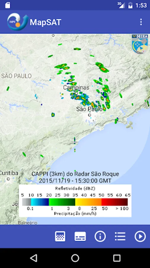 To monitor areas with potential for precipitation, the MapSAT application provides the latest meteorological radar images scattered throughout the national territory, belonging to the DECEA / Redemet, Cemaden, INEA and Ipmet / Unesp network.