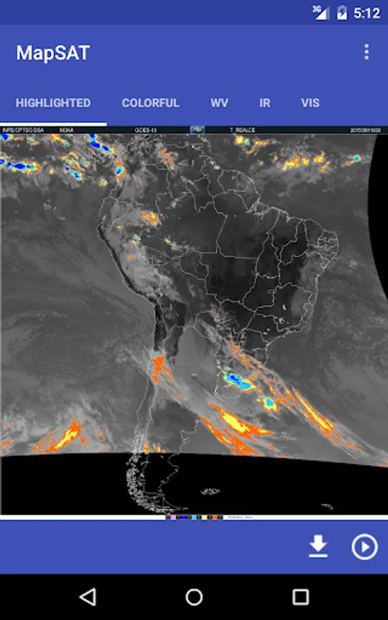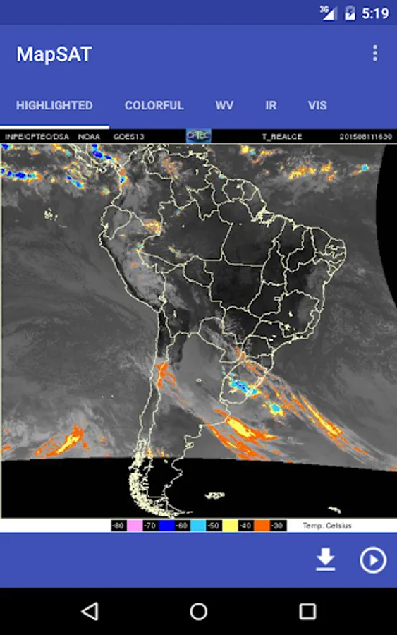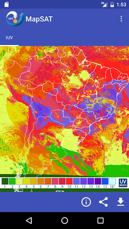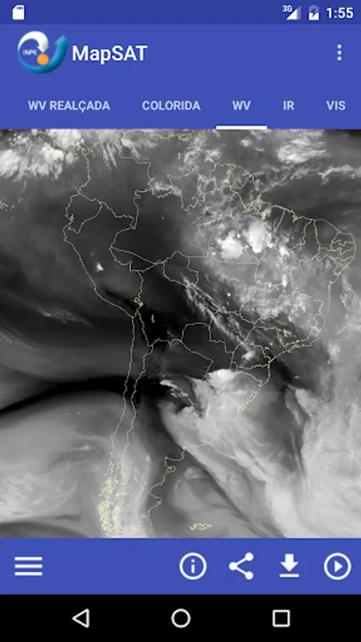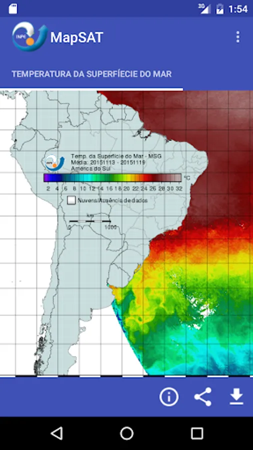 The application allows the visualization of the latest processed images from meteorological satellites to the infrared and visible water vapor channels in simple and highlighted images format with Latin American coverage. In addition, some products derived from satellite data are available, such as ultraviolet index (UVI), sea surface temperature and sea surface wind.