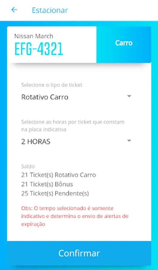 > Whenever you park in vacancies and observe, that in the description of the Card there is the word "Rotativo" followed by the time of permanence.