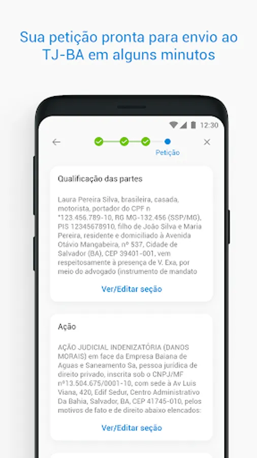 Upon completion of the information and the petition generated, the complaint becomes a legal process, with number, date and place of first hearing. You will then be able to follow the entire process movement through the application itself, receiving notification and reminders.