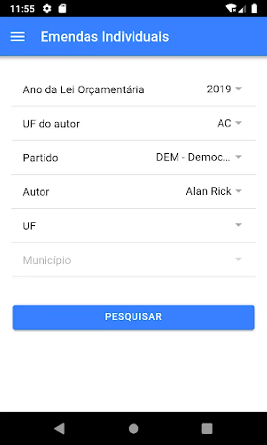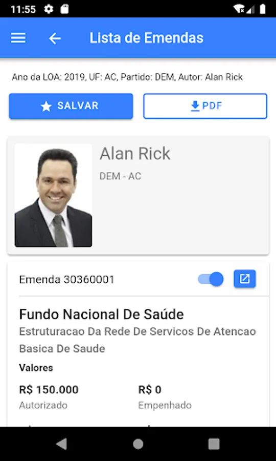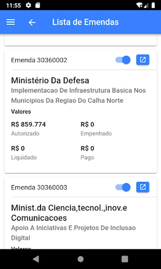 Application for smartphones and tablets, accessible to any citizen, which provides information on the execution of parliamentary amendments and budgetary actions. The goal is to facilitate federal budget tracking by allowing you to save individual amendments and bench amendments as “favorites”. In addition, the application enables you to enable receiving notifications when specific amendments are updated or performed. Its content is arranged in a menu with the following themes and options: