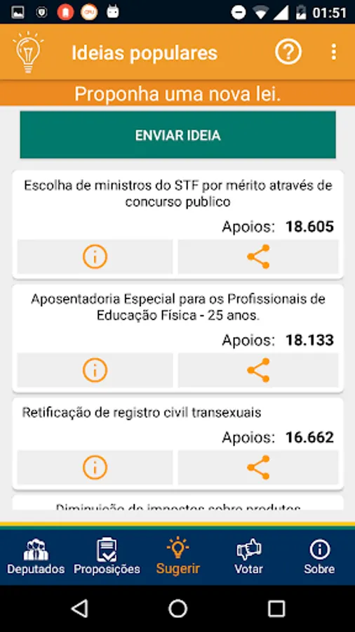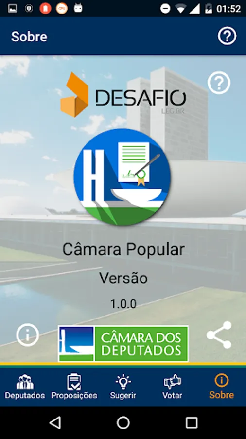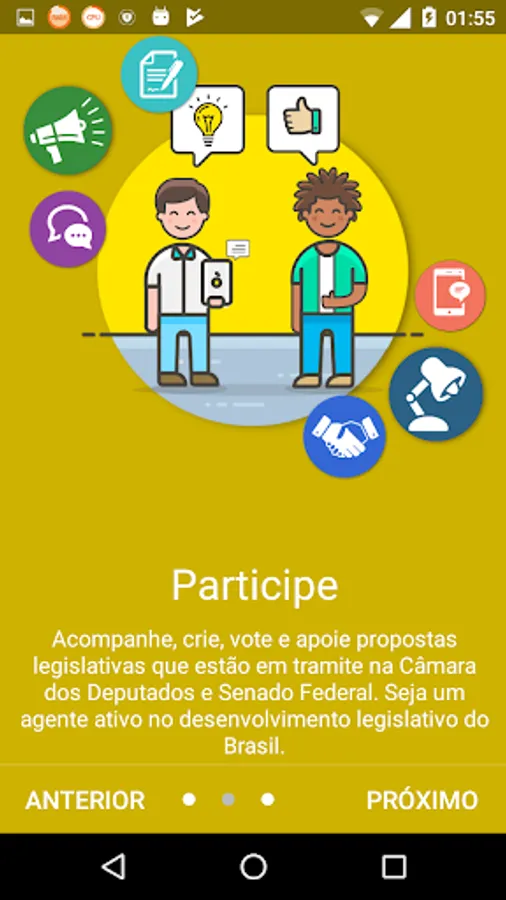 Through the Chamber Popular users can access and support ideas Legislative, access to functionality Send legislative ideas and gives positive or negative vote on the proposals through public consultation, data that is made available on the portal of e-citizenship of the Senate . Characteristics to the missing time in an application. Featuring also information on the proposals in the House, as well as list of propositions, details about a specific proposition and the historical steps in the processing of a proposal. In addition, the App aims to presents a simple and intuitive data relating to Members (as), such as parliamentary list in exercise and relevant data, the organs of which a Member (a) is an integral, expenditure on parliamentary exercise (a) by (a), and events with the participation of parliamentary make up the House of Representatives. For a closer users with (the) parliamentarians. The data were arranged in an attempt to be presented synthesized and easily enough to cover relevant details and enable engagement of users as well as provide access and means of communication with such representatives.