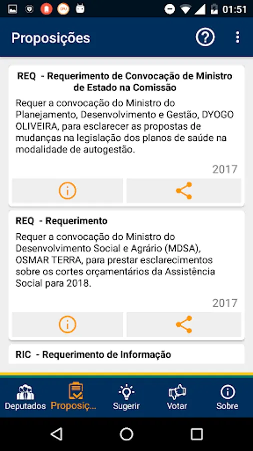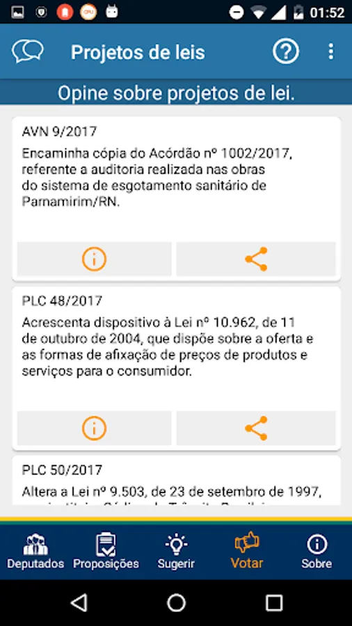 List, display filters, details, vote for or against, see procedure and details, and share information.