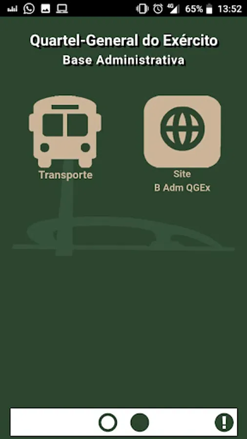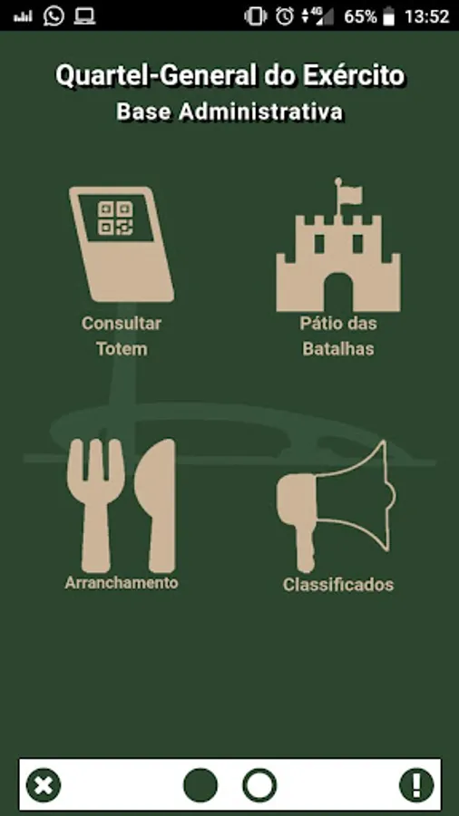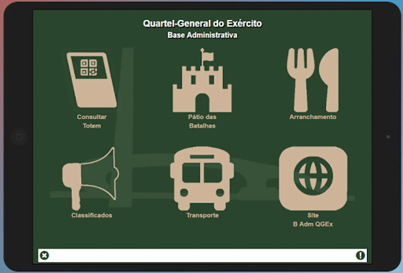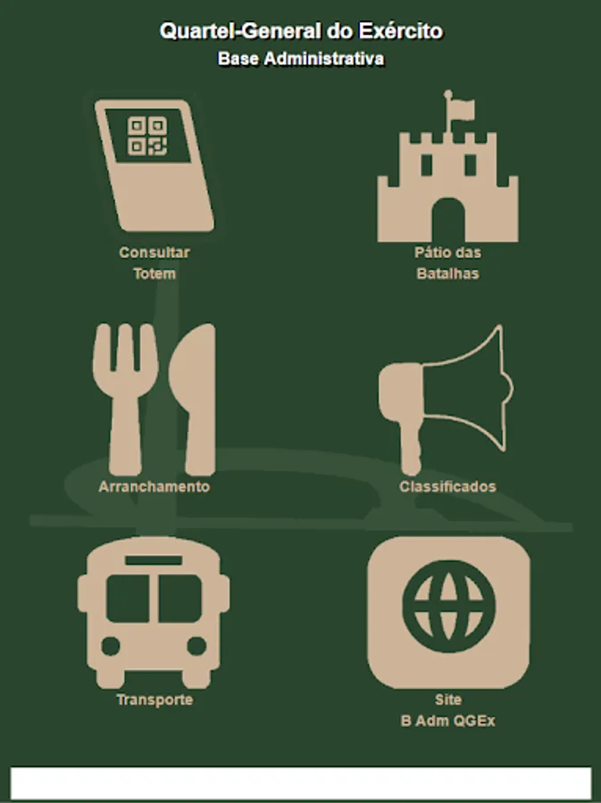 The Administrative Base of the Brazilian Army Headquarters, located in Brasília, Federal District, provides through this application a portal with links for quick access to its main services, available to users of its facilities, such as Plucking, Classifieds and Transportation and to the visitors information about the battles in Pátio das Batallas