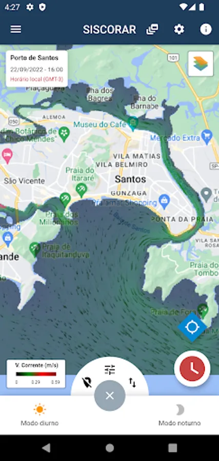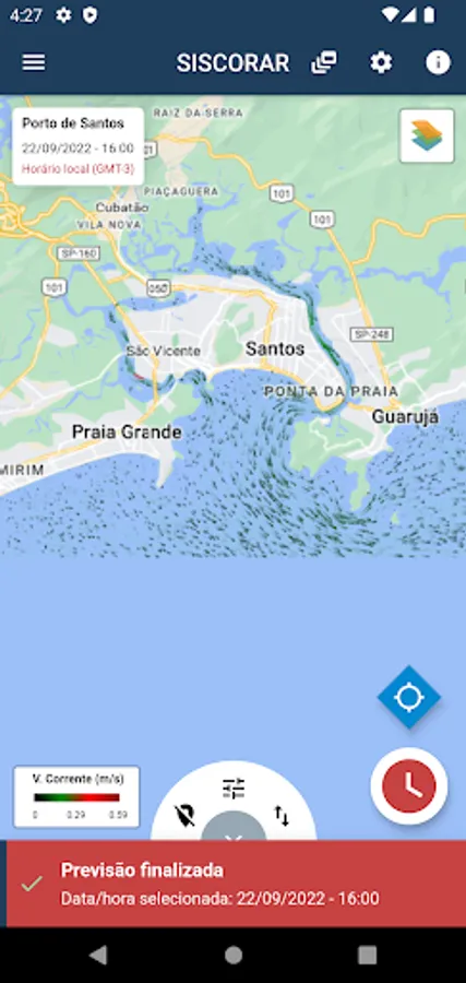 This application is capable of predicting the intensity and direction of the current generated by the astronomical tide in shallow waters for the geographic area comprised by Guanabara Bay and surrounding areas, in Rio de Janeiro; to Sepetiba Bay and surrounding areas, also in Rio de Janeiro; to the Port of Santos and surrounding areas, in São Paulo and to the Port of Paranaguá and surrounding areas, in Paraná.