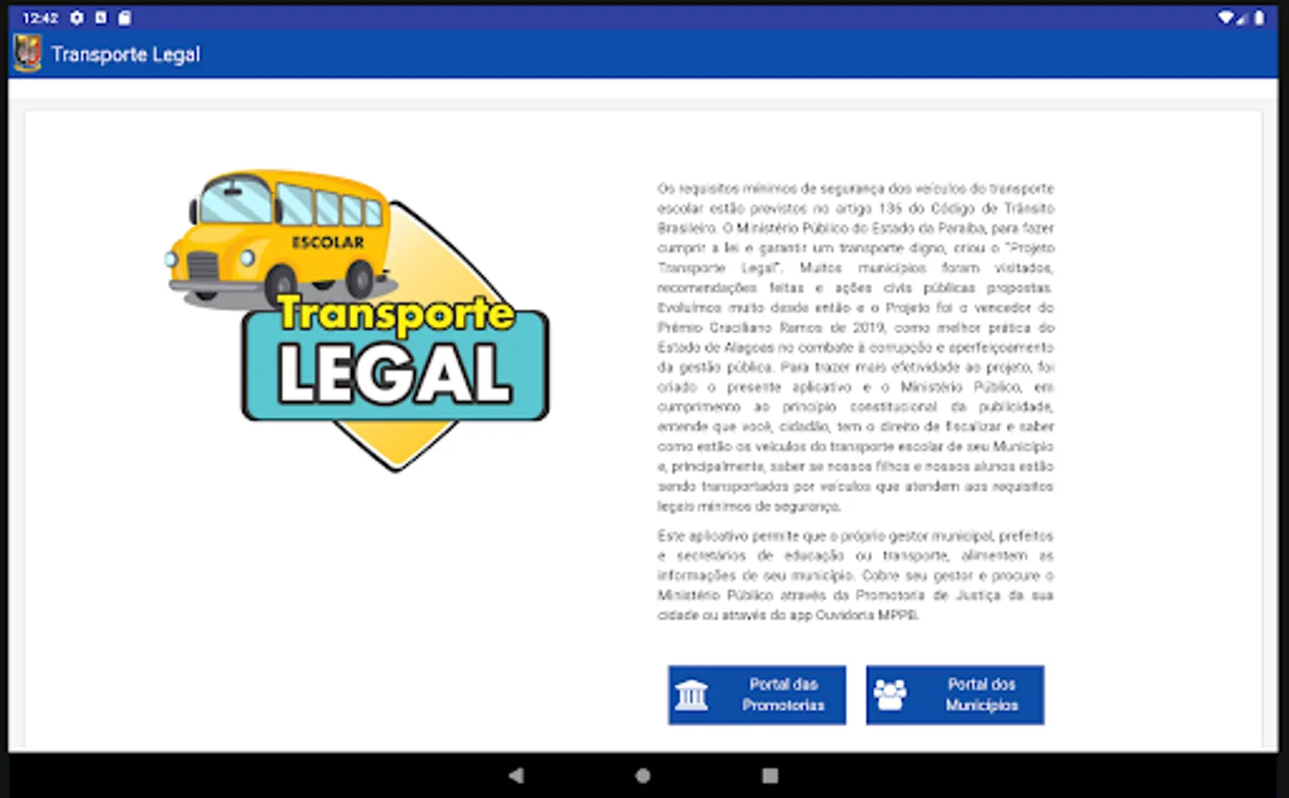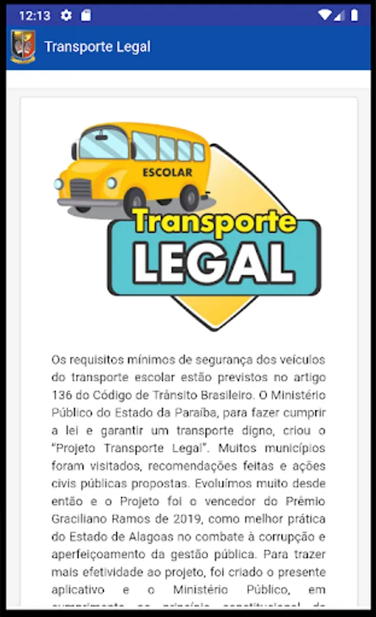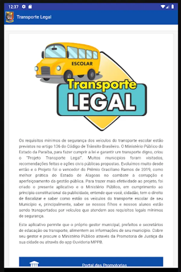 The Public Ministry of the State of Paraíba, to enforce the law and ensure decent transport, created the “Legal Transport Project”. Many municipalities were visited, recommendations made and public civil actions proposed. We have evolved a lot since then and the Project was the winner of the 2019 Graciliano Ramos Award, as the best practice of the State of Alagoas in combating corruption and improving public management. To bring more effectiveness to the project, this application was created and the Public Ministry, in compliance with the constitutional principle of advertising, understands that you, a citizen, have the right to inspect and know how the school transport vehicles in your Municipality are doing and, mainly, to know if our children and our students are being transported by vehicles that meet the minimum legal safety requirements.