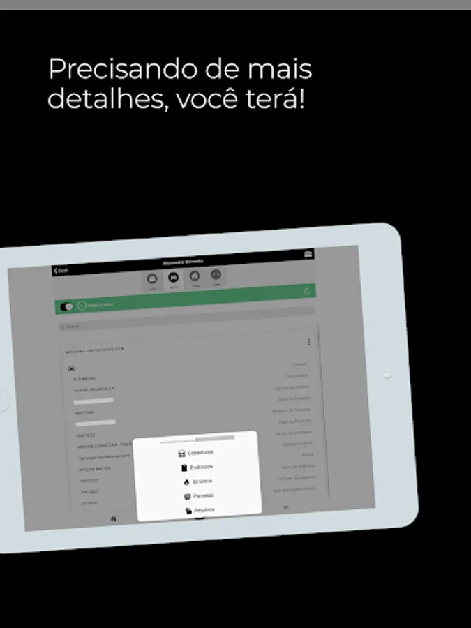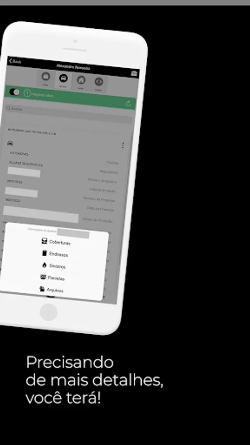 Filter Active and Inactive Documents, in order to keep a history of the client's documents; paid, scheduled and overdue installments, claims in progress and finalized; Information on endorsements made; Write-off of Files (Single and Linked): Files corresponding or not to a Policy.