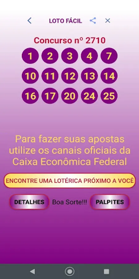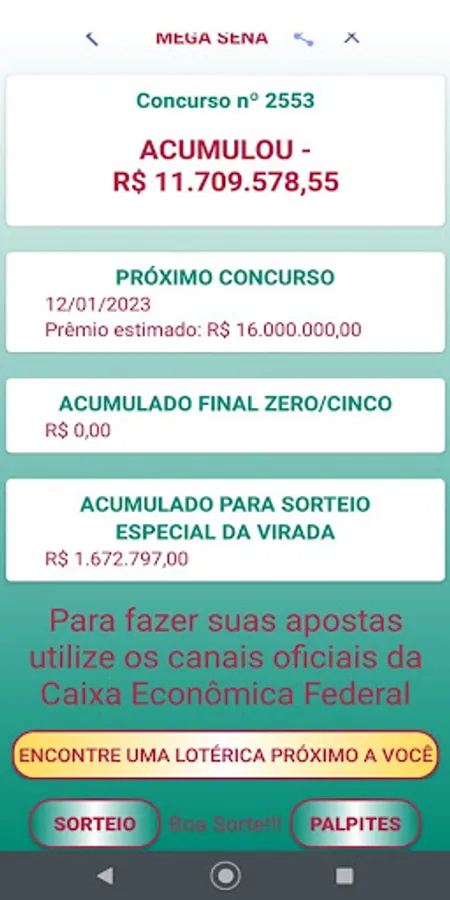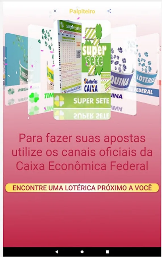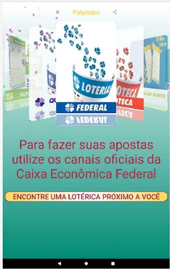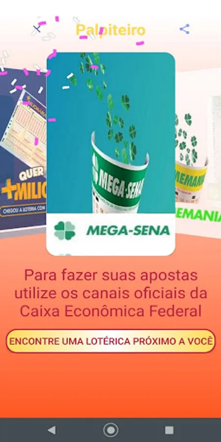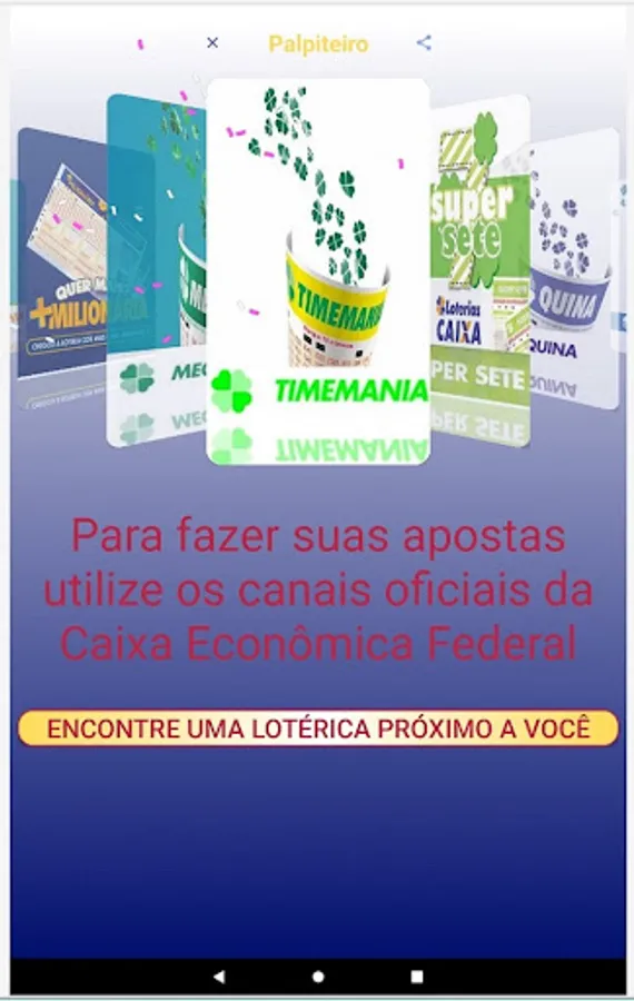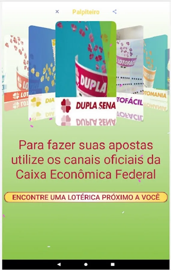 We clarify that the Palpiteiro APP does not place bets and also does not generate "magic numbers". We believe in people's intuition and we only intend to help them by bringing guesses that are generated at random and also informing the numbers drawn in the last contests.