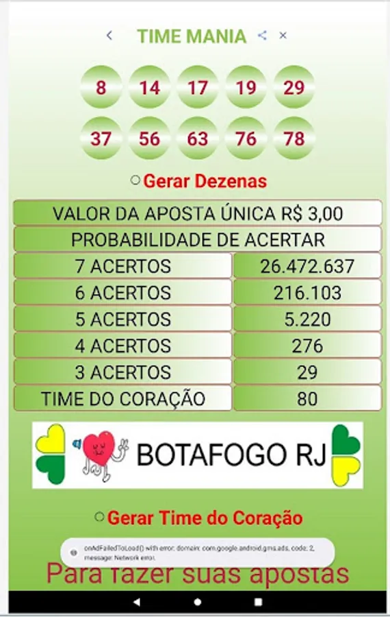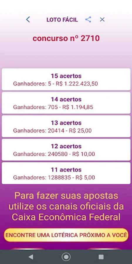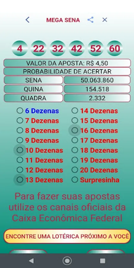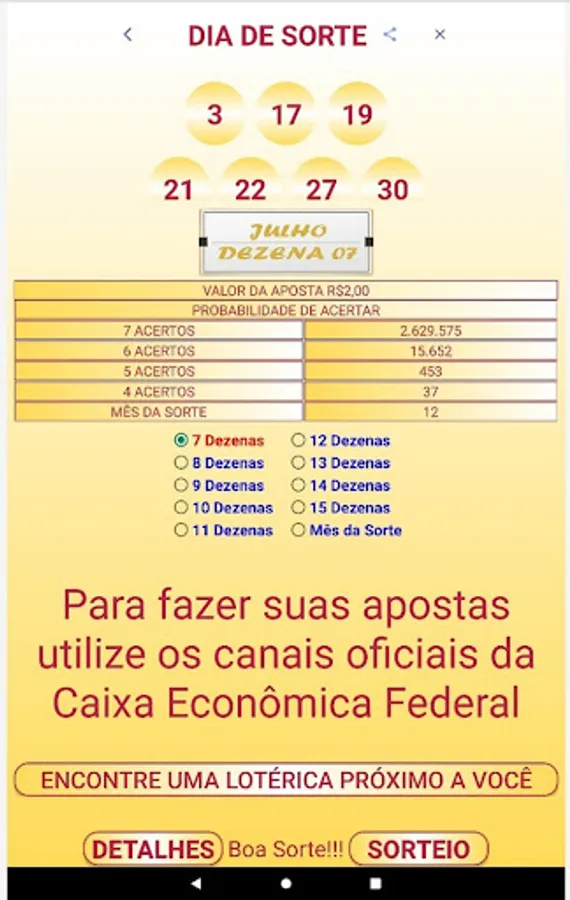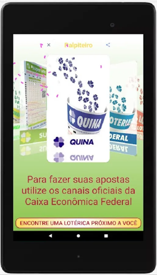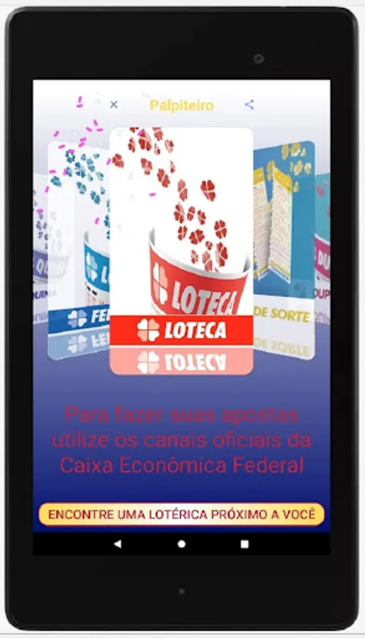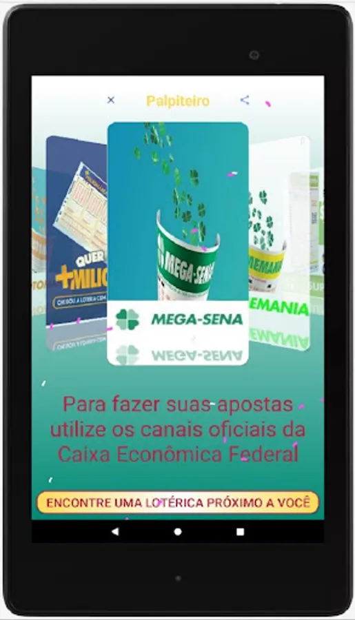 We clarify that the Palpiteiro APP does not place bets and also does not generate "magic numbers". We believe in people's intuition and we only intend to help them by bringing guesses that are generated at random and also informing the numbers drawn in the last contests.