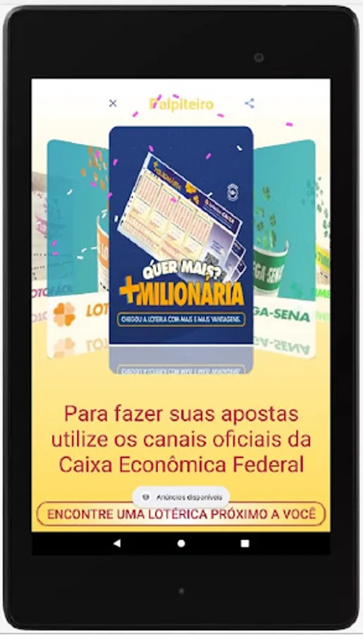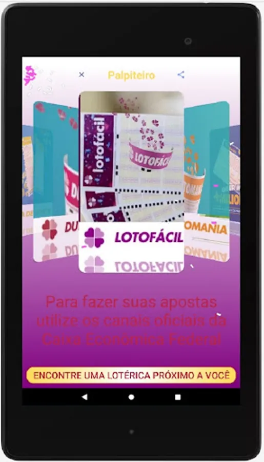 The APP Palpiteiro is free and does not require any registration to use it. Easy to handle, the user can browse the various national lotteries, such as Mega-Sena, Dupla-Sena, Loto-Facil, Loto-Mania, Time-Mania, Quina, Mais Milionária, Super Sete, Dia de Sorte, Loteria Federal and Loteca.