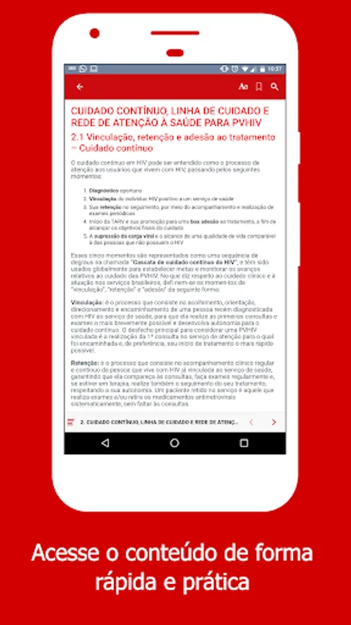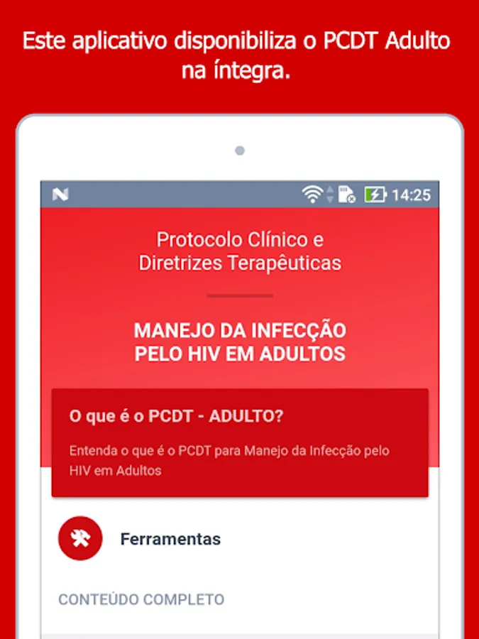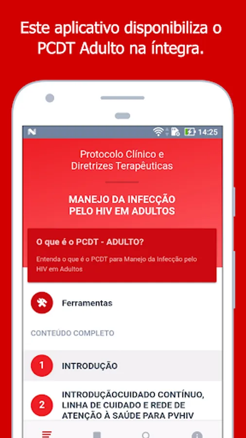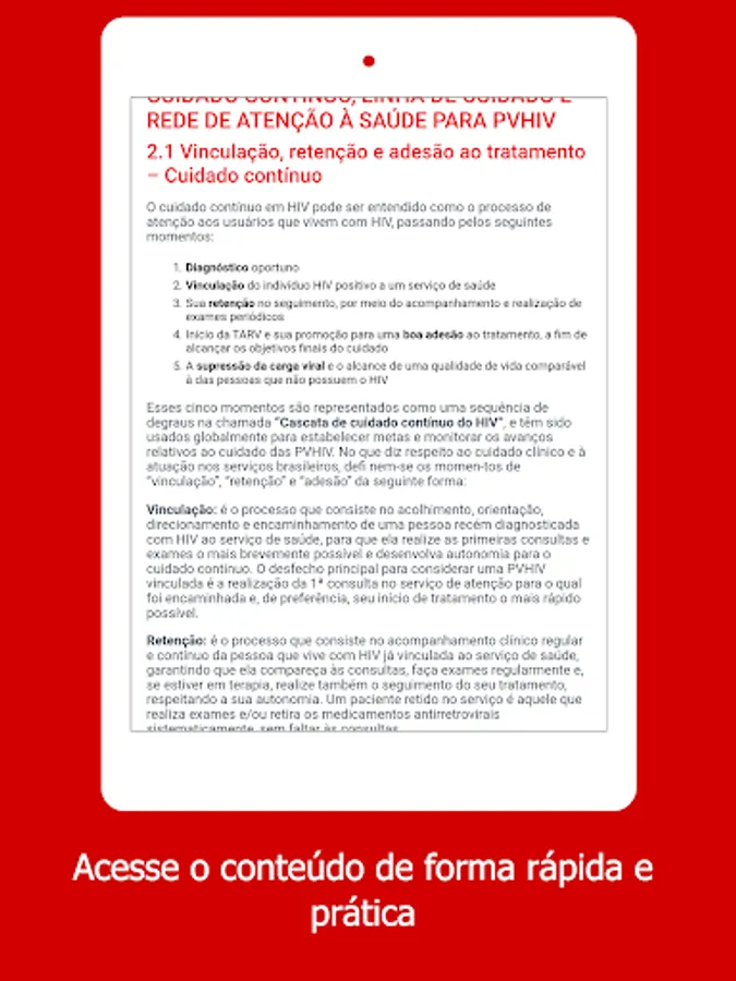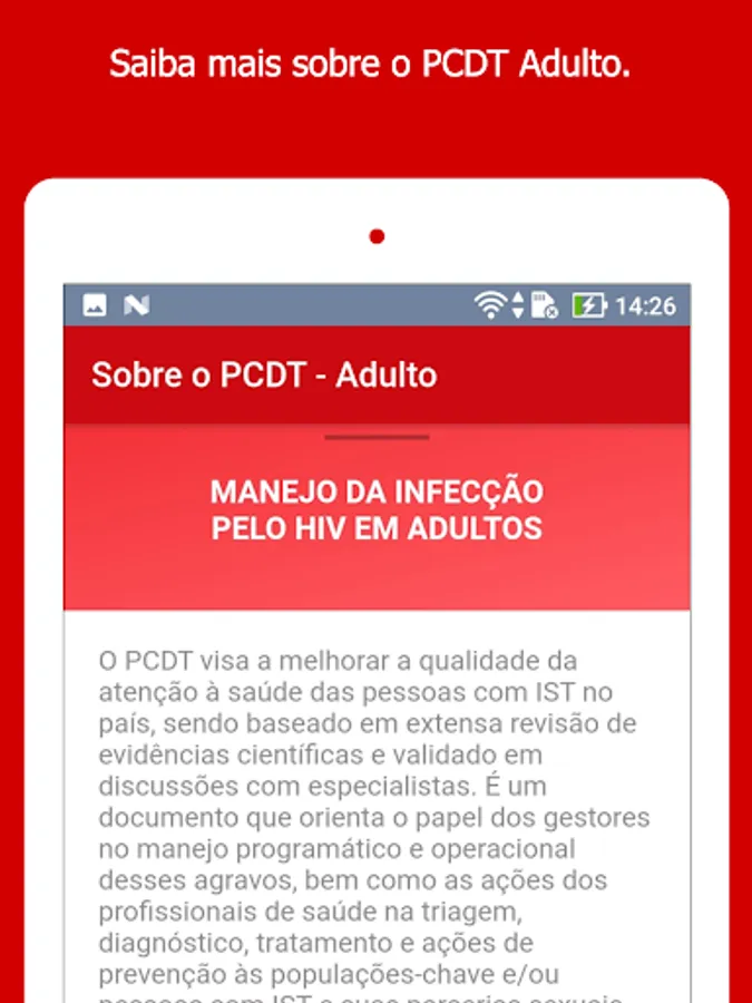 The PCDT Adults application aims to provide the full content of the document produced by the Ministry of Health in a practical platform, simple and easy to understand. The application also provides tools that can be used to facilitate the service.