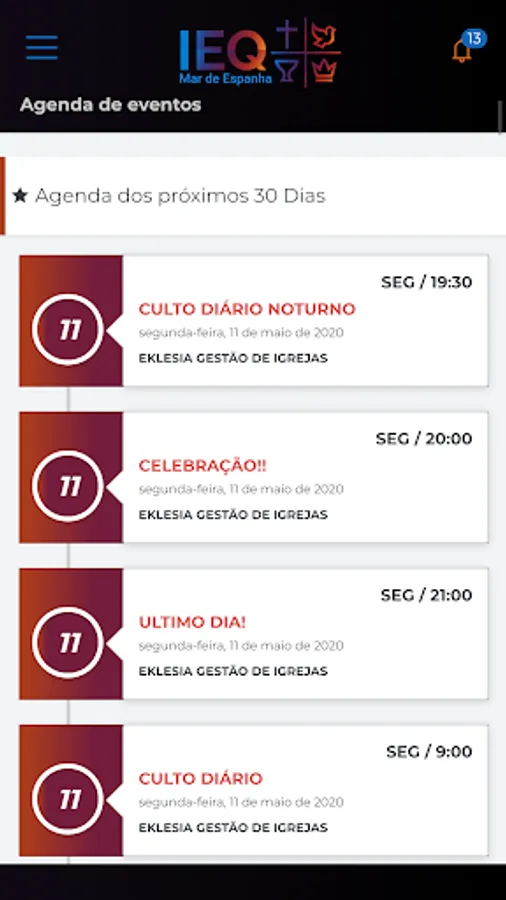 * "Agenda": See a complete calendar of Cults, Events, its Scale in Ministries / Departments of the Church;