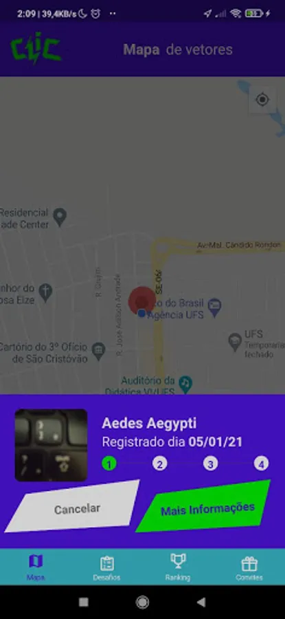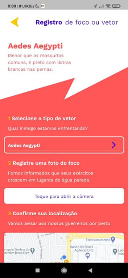 The application aims to keep both users and the public aware of the presence of vectors in the regions through collaborative records. The user is the key element in this process: through his observation he can share his location, select which type of vector focus was found and photograph the focus, making this record available for access to the entire tagged user network. in the map. The government may also use this information, which will be available in a panel, to help in decision making actions, cross-referencing other data that will be collected from different sources.