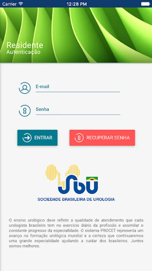 App developed for the exclusive use of residents belonging to the Residency Program in Urology of the Brazilian Society of Urology (SBU), allowing access to Procet, management system of urological training provided by the SBU that gives real-time information that guarantees you to training full urology and submitting your Residency Program in Urology evaluation of their peers resulting in obtaining the quality seal given by the SBU. With the App Resident can access your schedule of daily activities, carry out the inclusion of its scientific, academic production and all its practical activities during their period of residence.