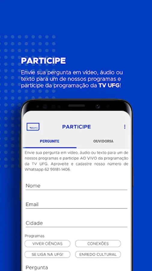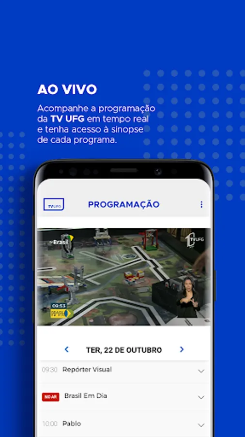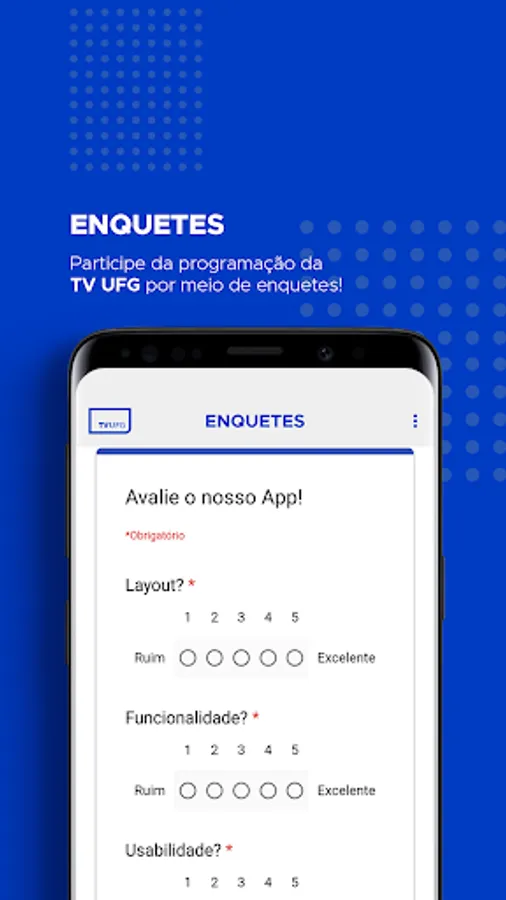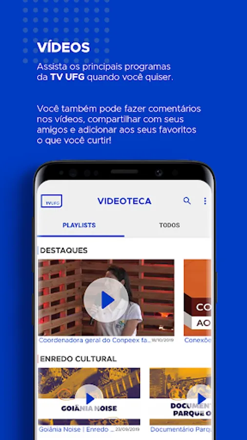 It's free and easy to use! It was developed by the Educational and Cultural Radio and Television Foundation (RTVE), which has the concession of the television station TV UFG, associated with TV Brasil (Empresa Brasil de Comunicação). Through it you can watch live UFG TV programming, watch the broadcasts of the station whenever and wherever you want, participate in polls, send questions and share with your friends what you liked. TV UFG is an educational and cultural broadcaster that prioritizes content that is educational - but not necessarily didactic - and that promotes culture, art and information. Are you curious? Discover your #TVUFG
