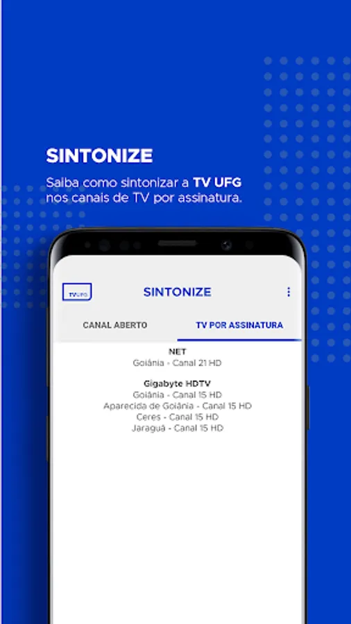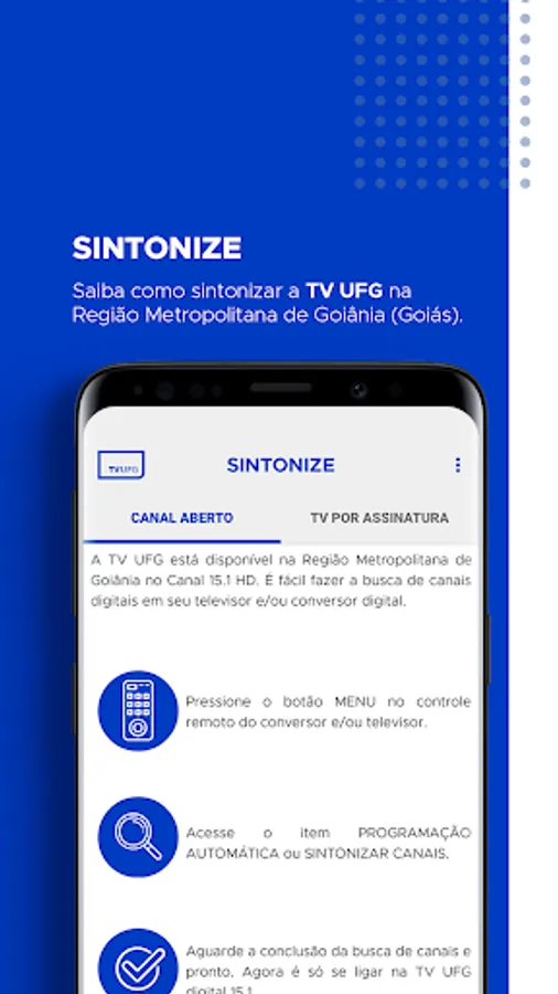 Learn how to tune UFG TV in the Goiânia Metropolitan Region (Goiás).