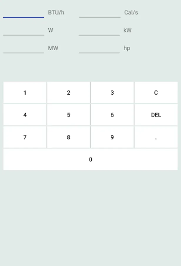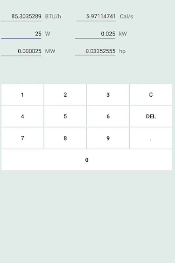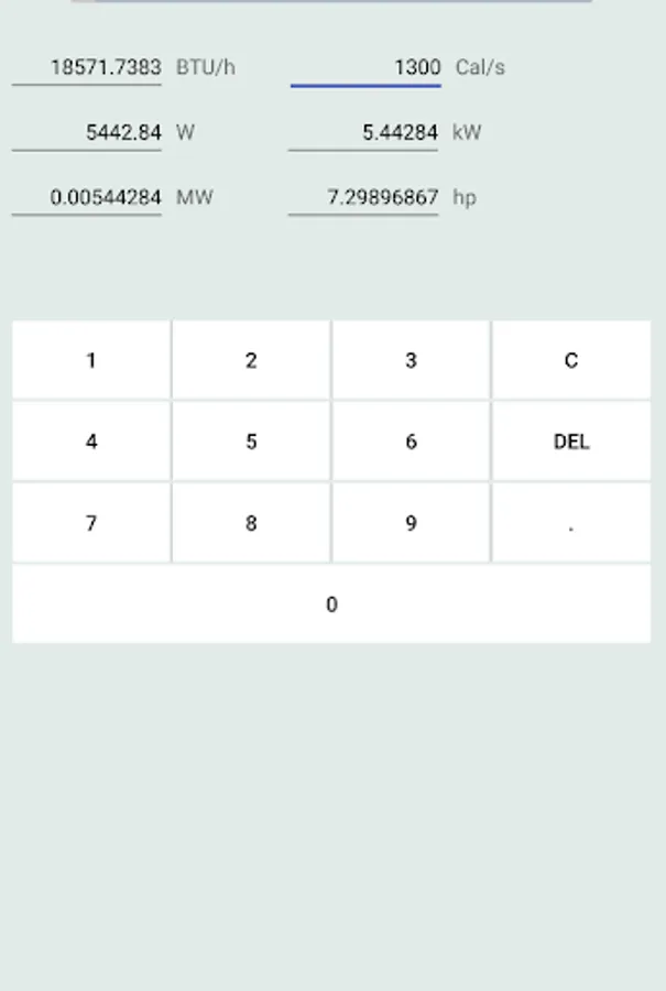 This app converts units of power from BTU/h, Cal/s, W(jules/s), kW, MW, hp to another.