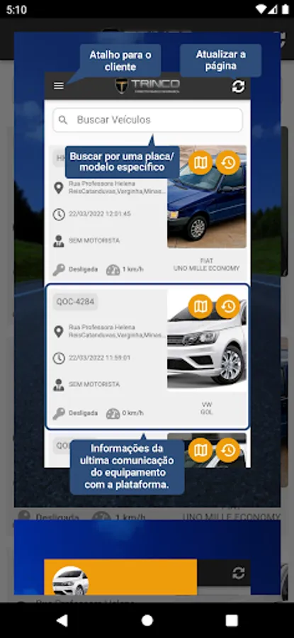 TrincoSat allows you to see the location of vehicles in real time, in addition to the latest records, with address, date and time.