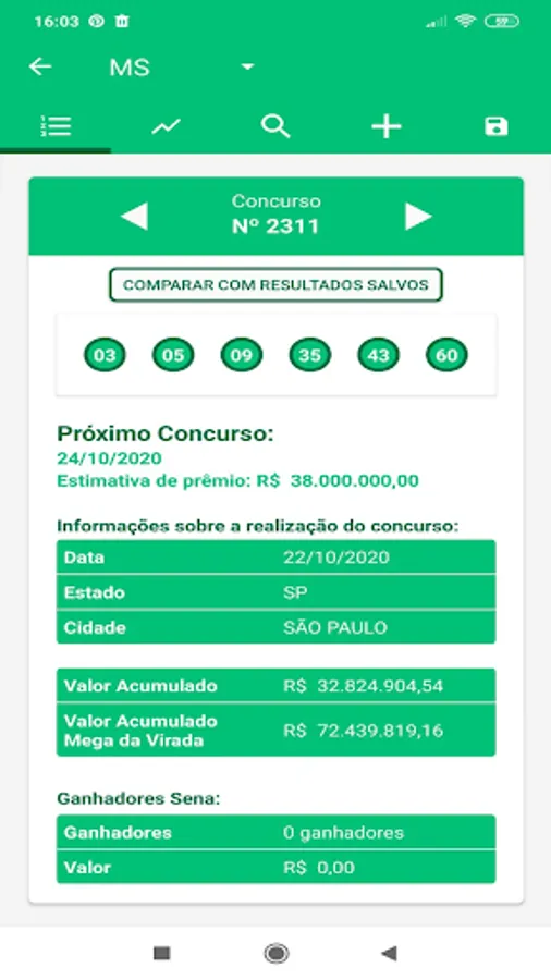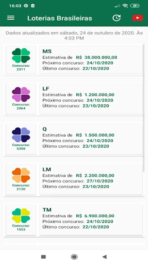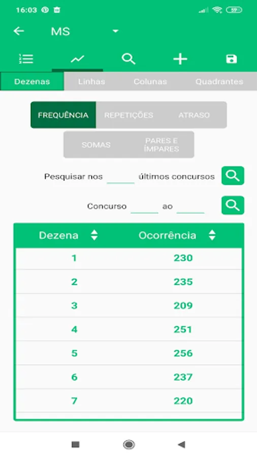 Application for generating and viewing results of Brazilian lotteries, it is possible to see the history of frequency, repetitions and delay of the tens.