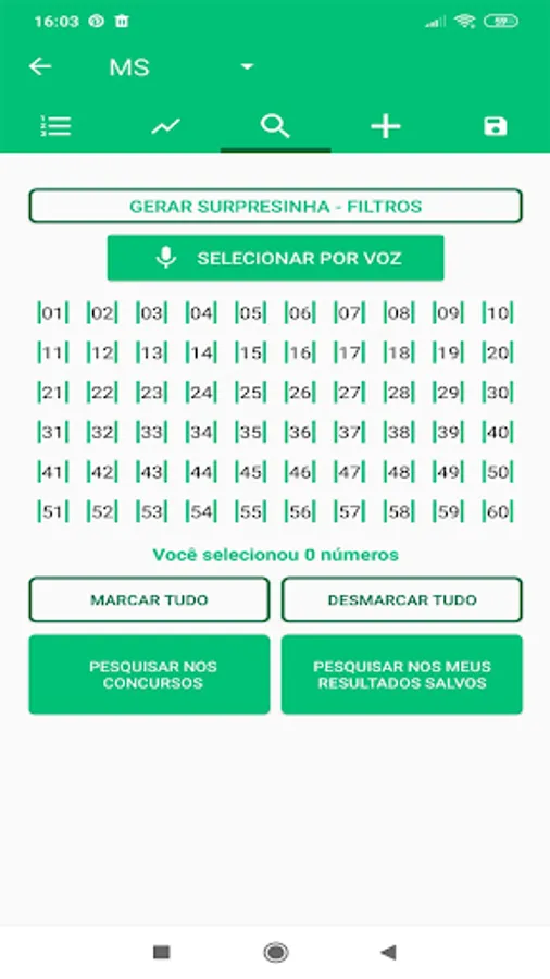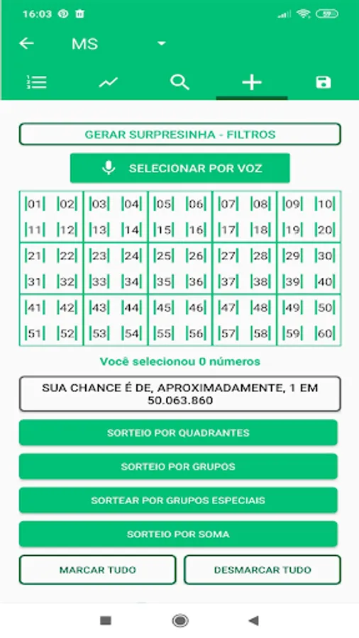 It is possible to generate "SURPRESINHA" games and random games with their numbers manually defined (being possible to fix one or more tens by giving 2 clicks on the chosen tens).