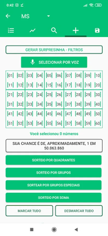 We have a powerful game generation tool, with the possibility of using different techniques to generate cards for your lottery bets. Generation of up to 9999 cards, without repetitions!