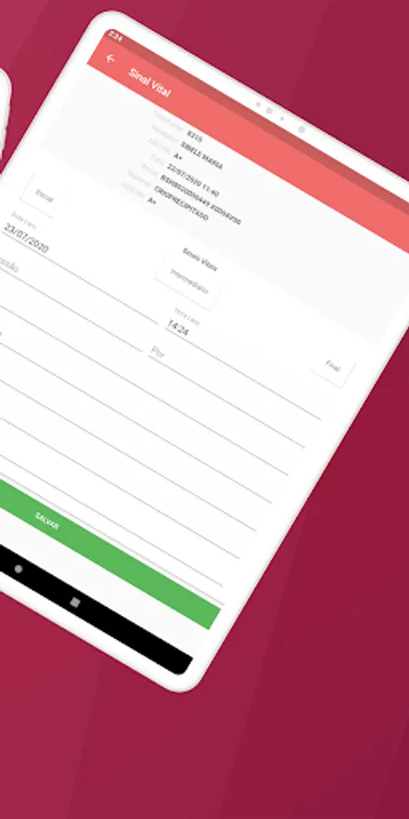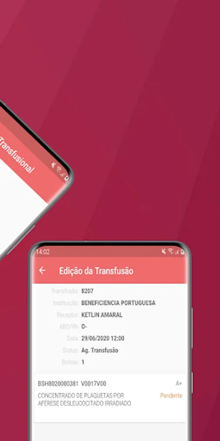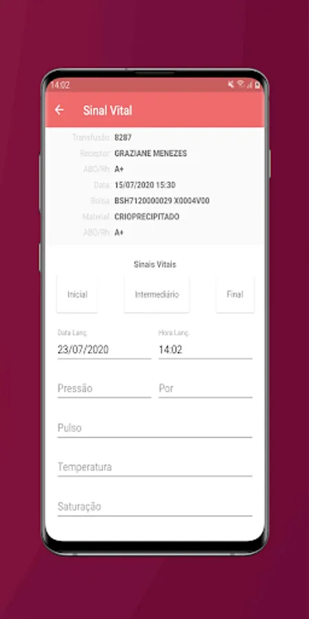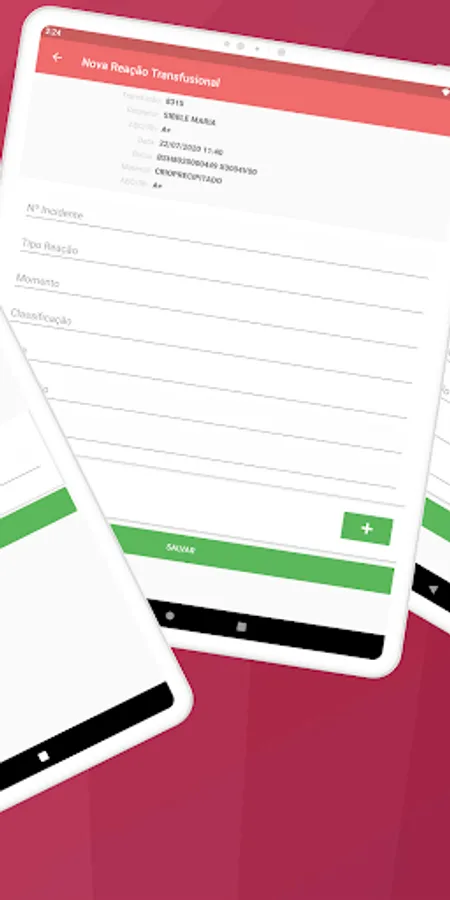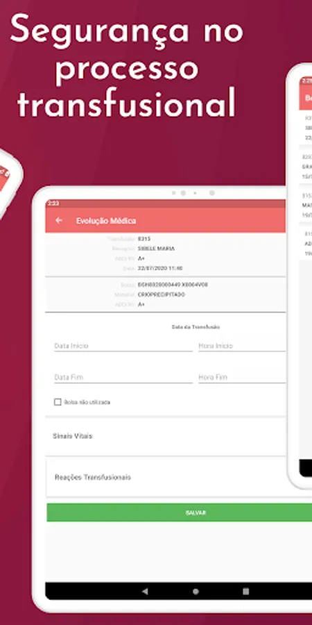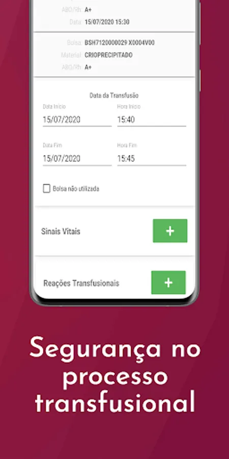 It is also possible to confirm patient information, such as personal data and type of material requested for transfusion by reading the bar codes. After confirming the patient's data and the blood component that will be transfused, it is possible to record the Date and Time data of the beginning of the Transfusion, Date and End Time, clinical data of the medical evolution, procedure complications, among others.