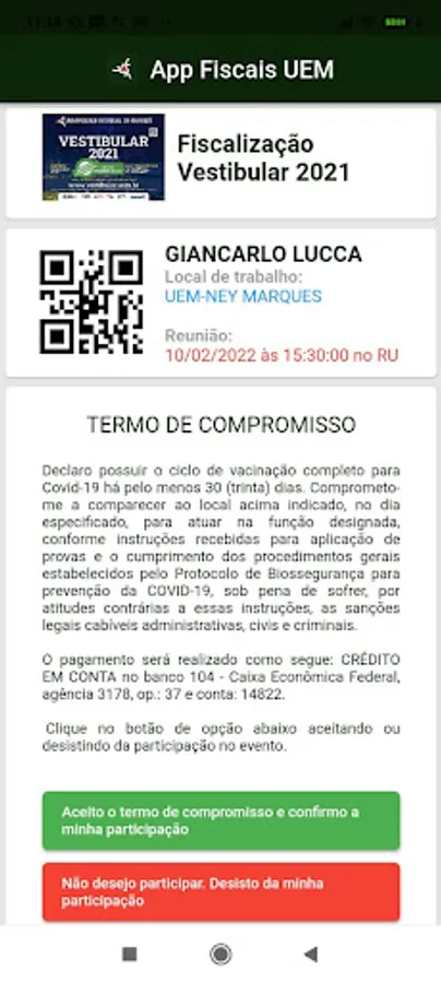 The App Fiscal UEM is an application developed by the Unified Vestibular Commission (CVU) of the State University of Maringá (UEM). From the installation, the user will be able to follow the process of calling the inspection in the entrance exams or Serial Assessment processes (PAS). You can also digitally sign the term of commitment and accept or decline to participate in the event. Another important feature is the notification system. The user will be able to receive notifications about the registration deadlines for new events, about the dates of the summons and also the information of his individual summons.