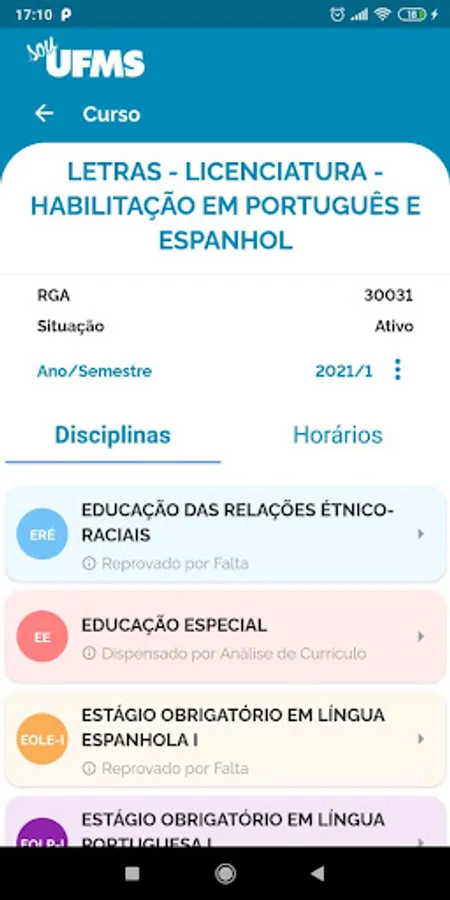 The academic must use their passport and password to access the application data. After accessing, your active and inactive RGAs will be displayed so that you can consult the data of the disciplines of each semester in which you were enrolled.