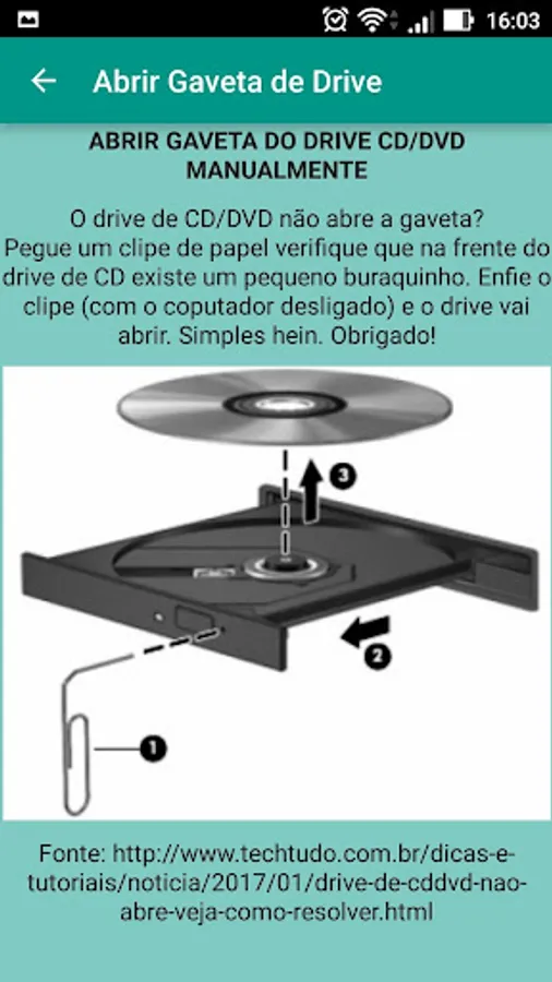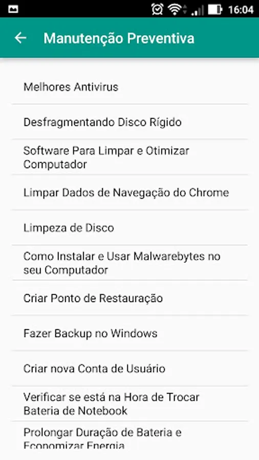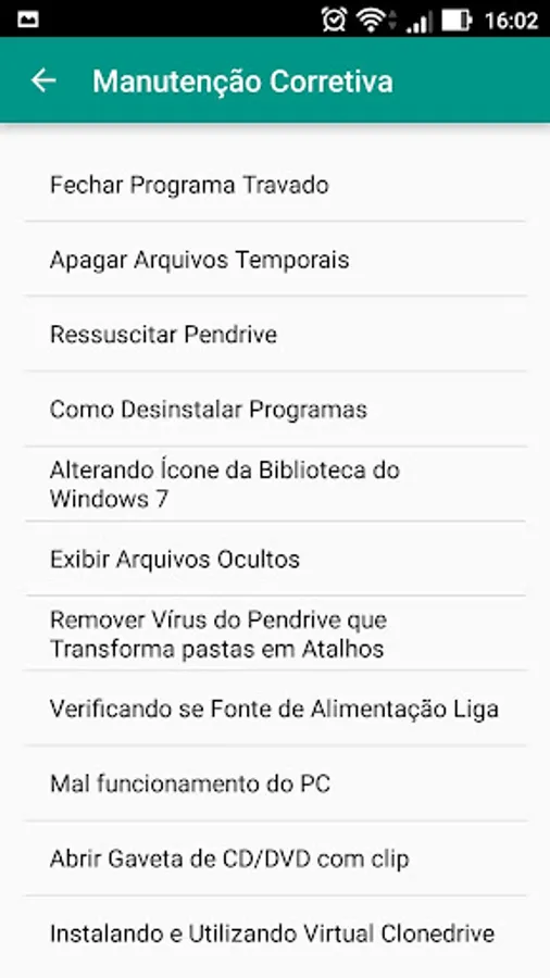 This application aims to help personal computer users to solve common daily problems. In addition, this application presents options Corrective and Preventive solutions for maintenance. This application was developed by students of UFPA's information systems during the course of III Extension activities. This application is linked to the Extension Project "Application Development for Mobile Phones: Workshop for Students Public Network Cametá, UFPA PIBEX 2015".