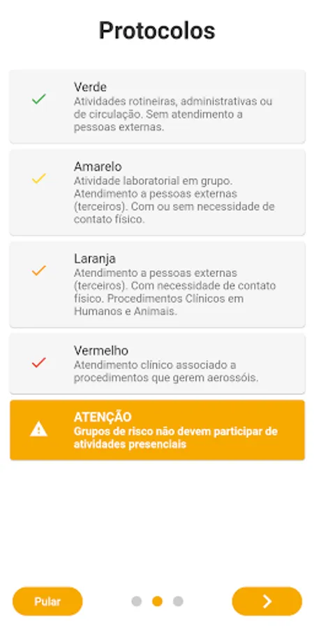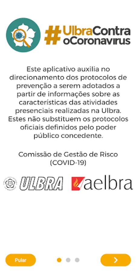 This application helps to guide the prevention protocols to be adopted based on information about the characteristics of the face-to-face activities carried out at Ulbra. These do not replace the official protocols defined by the granting public authority: