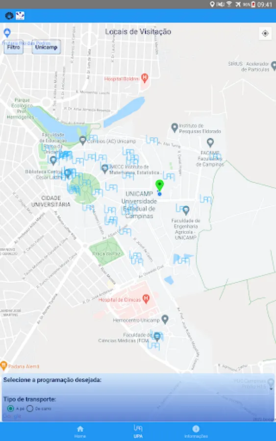 The application "UPA" developed by the Unicamp Computing Center, is to provide participants UPA (Unicamp Open Doors), which have a mobile device ease of geolocation. From the participant's location, the application draws shift routes to the desired point.