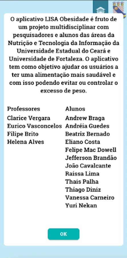 The Lisa Obesity application arose from the need to help the general public to control their weight due to the growing number of cases of Obesity in our country. This application will bring you tips based on the Food Guide for the Brazilian Population that will help you to have a more balanced diet. balanced and healthy. In addition, you will be able to record your meals and have feedback from a team of professionals and students in the area of nutrition guiding you on what may or may not improve on that meal and you will be able to record and monitor your evolution through this application, recording your weight and height periodically. and following through the graph. The application also brings the location of the centers specialized in treatment of Obesity closest to you, in the City of Fortaleza.