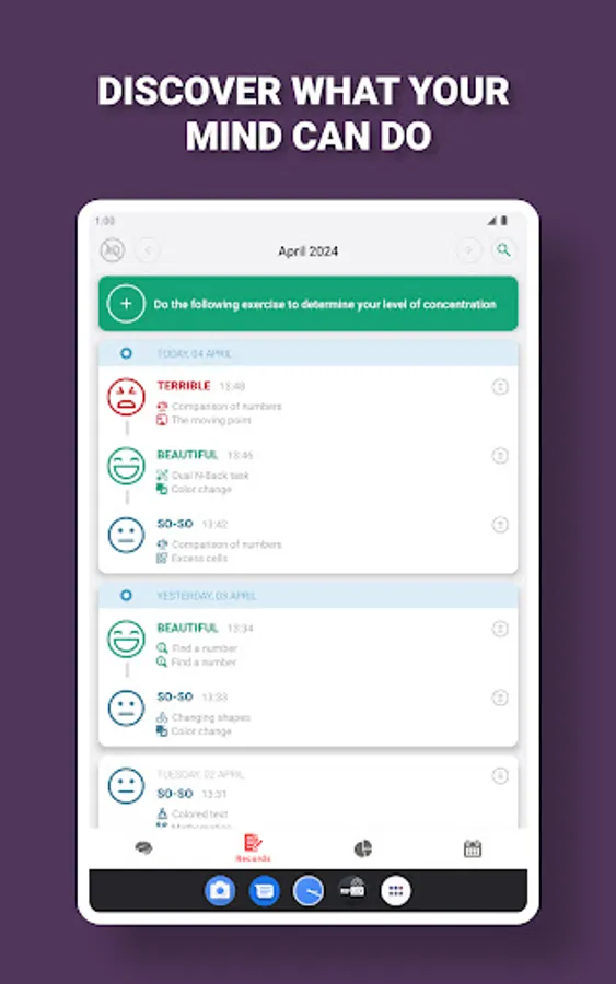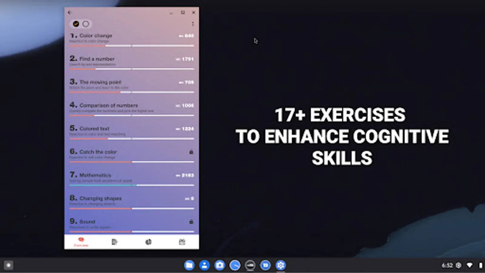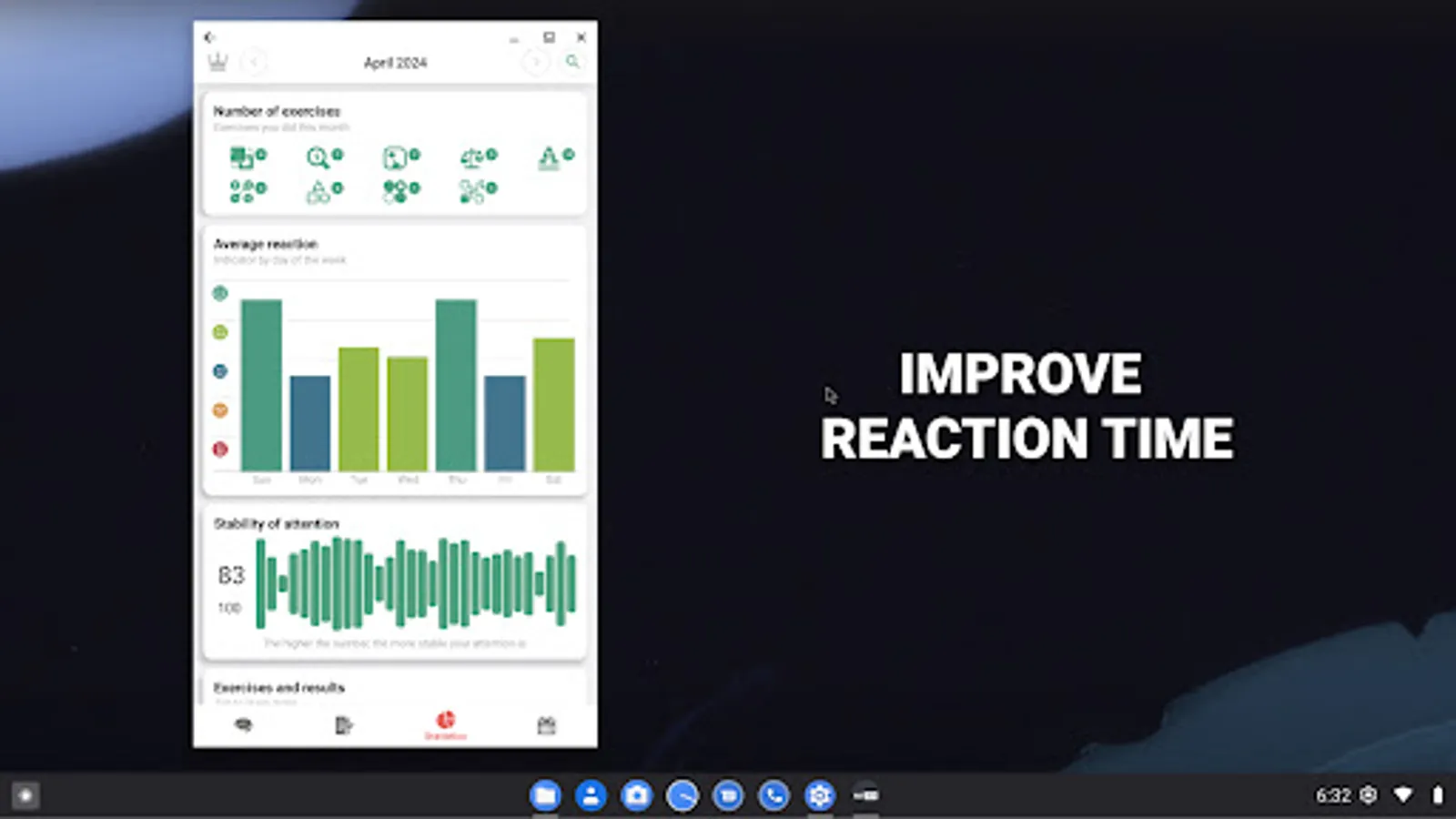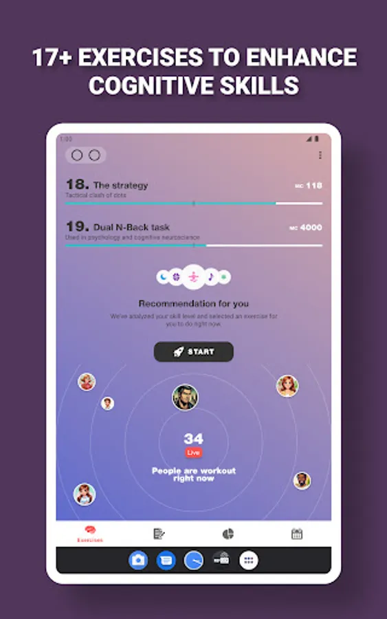 On the main screen you are offered a set of exercises, select an exercise and its description will open. Click the strat button and begin the exercise. The program will ask you to perform a series of two approaches, this is done to more accurately assess your cognitive abilities and reduce the error in the calculations. After completing the exercise, the app will evaluate your result and show your progress on the statistics tab.