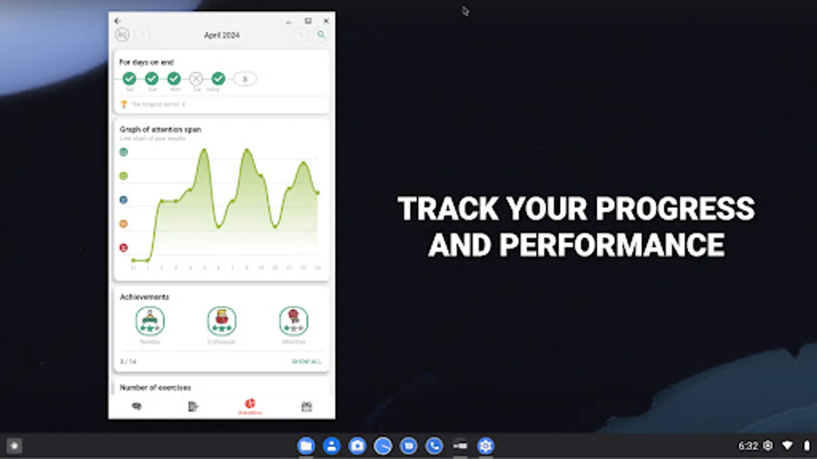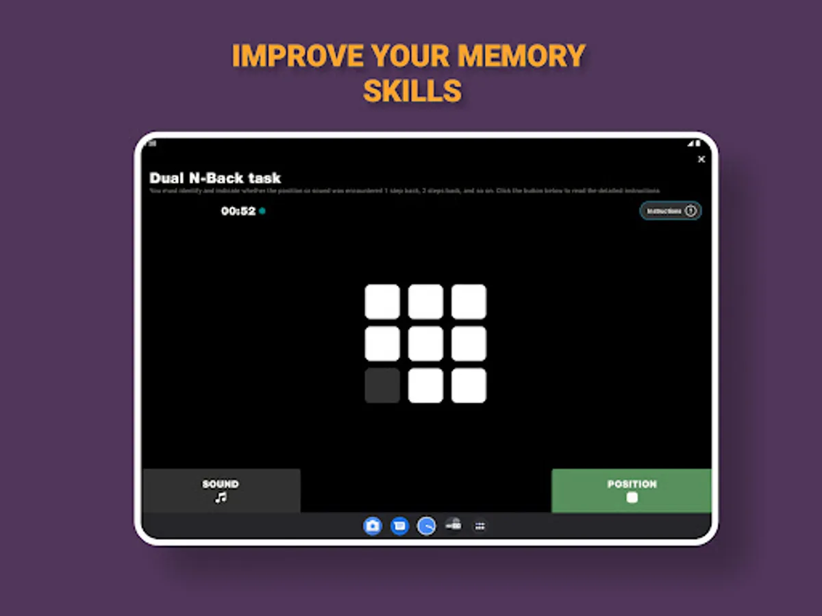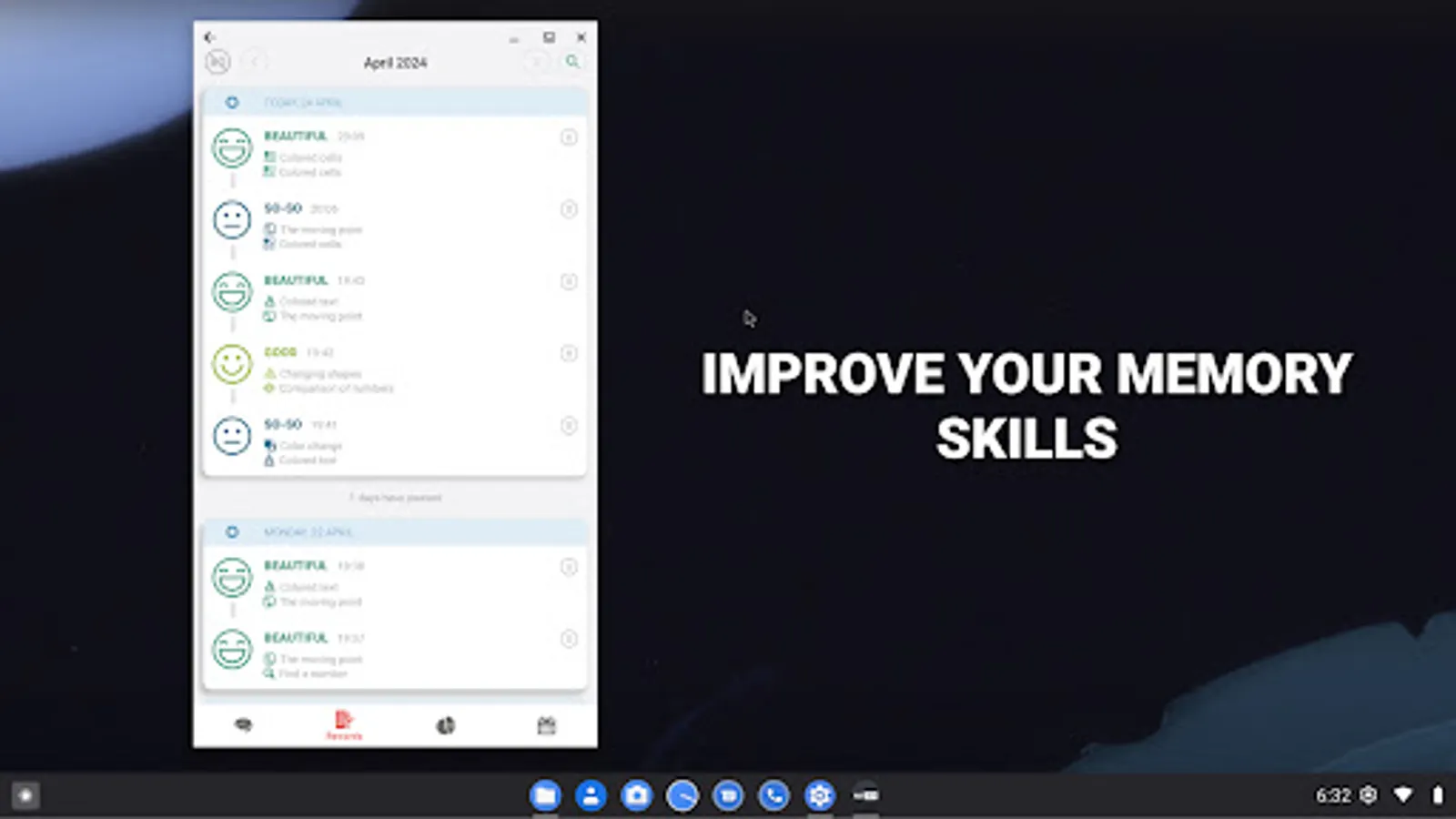 On the main screen you are offered a set of exercises, select an exercise and its description will open. Click the strat button and begin the exercise. The program will ask you to perform a series of two approaches, this is done to more accurately assess your cognitive abilities and reduce the error in the calculations. After completing the exercise, the app will evaluate your result and show your progress on the statistics tab.