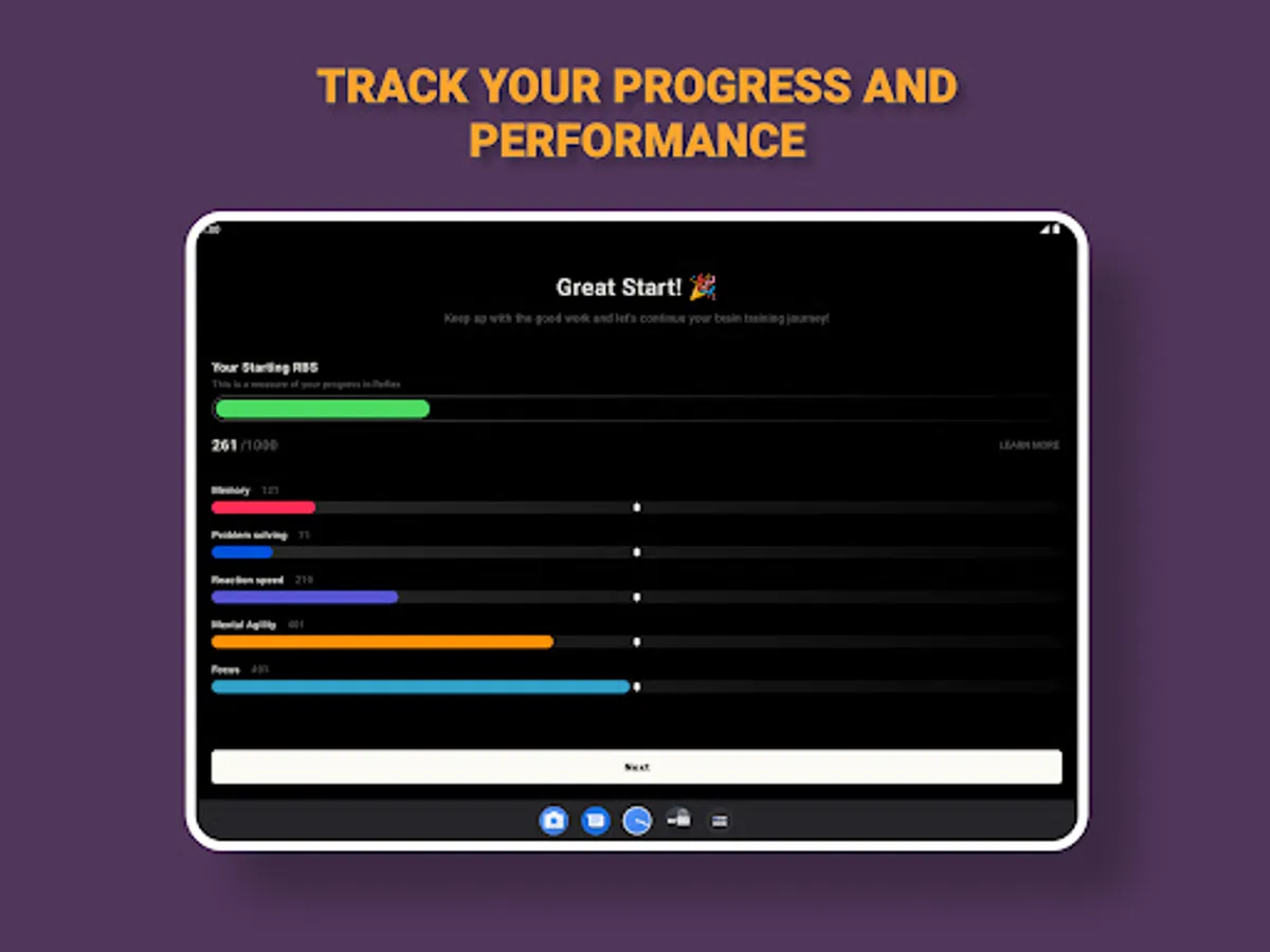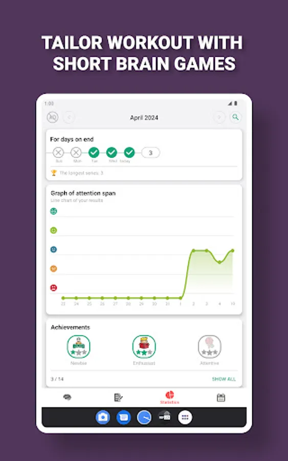 ⏺ Intelligent brain exercises tailored to enhance focus, mental quickness, mathematical skills, problem-solving abilities, and attention.
