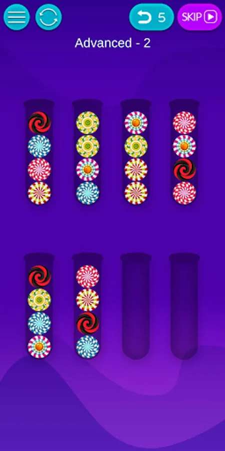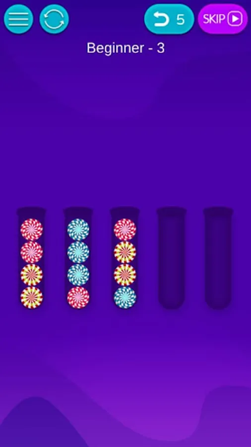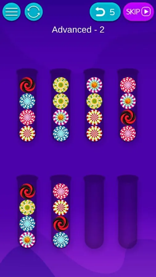 Sort the colored bubbles/Candys in the tubes until all bubbles with the same color stay in the same tube > 🤔 > 😊 > 🏆