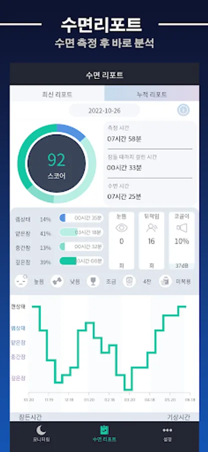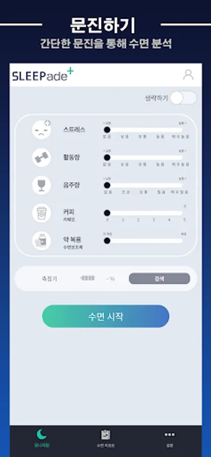 - Sleep score calculated by SLEEPade+'s own algorithm by analyzing more than 15 different sleep states such as pre-sleep questionnaire, sleep time, sleep cycle, and sleep habits