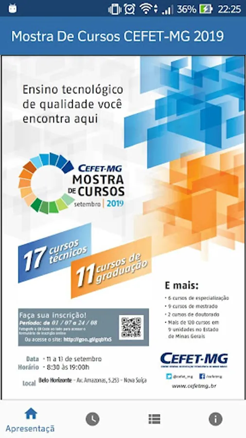 The Courses Show is held annually by CEFET-MG with the objective of presenting to the entire community of Belo Horizonte and the metropolitan region concerned, what are the courses offered by the Institution from the Technical, Undergraduate and Postgraduate level (masters and doctorate). It is noteworthy that as a public and federal institution all its regular courses are free and accessible through the selection process.