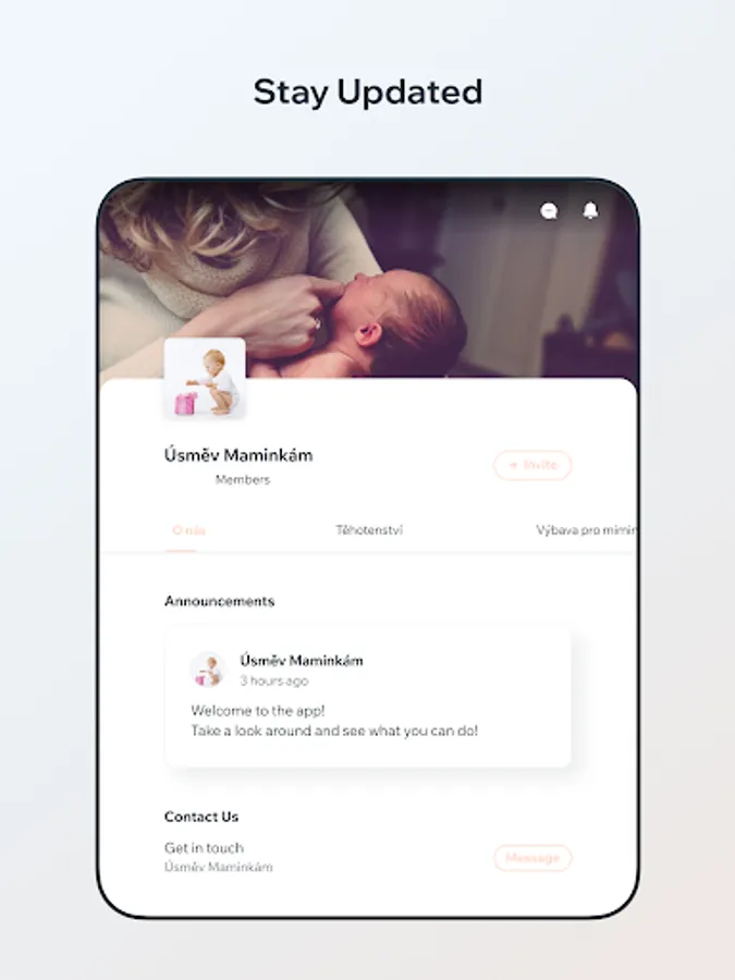Aplikace obsahuje informace pro maminky o období těhotenství, porodu a vývoje dítěte do 3 let. Naleznete v ní však informace i pro období, kdy bude Vaše dítě předškolák. Mimo základní a odborné články, obsahuje aplikace také slevové kódy, či možnost zapojit se do nejrůznějších soutěží.