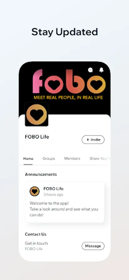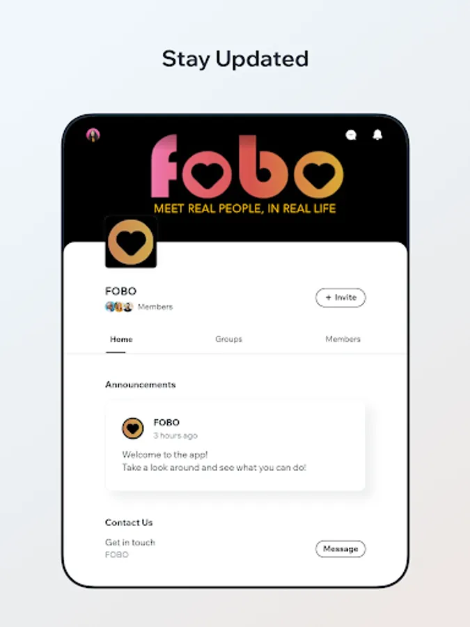FOBO is the first app to create Singles Community Groups. No Swiping, No match the chat, No upgrade to see your matches, females message first, or any of those other old, tired, gimmicky, and outdated ways of connecting with singles near you.